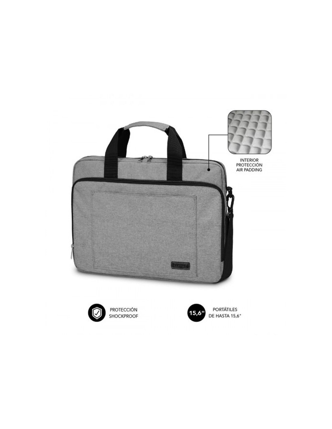 Elegante maletín para ordenadores portátiles de hasta 15.6 Sistema de protección Air Padding mediante burbujas acolchadas Fabricado en resistente poliéster Oxford Repele líquidos Doble cremallera en el bolsillo principal Dos compartimentos separados en el interior Bolsillo exterior de gran capacidad para documentos, bolígrafos, accesorios con organizador elástico y de malla Correa de hombro Fuertes asas y hebillas para un transporte seguro Cinta trasera ajustable a Trolley La protección total es una de las principales características del maletín para ordenadores portátiles Subblim Air Padding. En su exclusivo departamento para el ordenador cuenta con un revestimiento de burbujas acolchadas (Air Padding) que proporciona una protección excelente contra golpes o caídas accidentales. Diseñado con múltiples compartimentos. En el bolsillo frontal cuenta con un organizador de accesorios con espacio suficiente y muy fácil de transportar correctamente los artículos de uso diario resultando de gran utilidad para su trabajo o viaje. Gracias a los resistentes materiales de fabricación es capaz de repeler el agua y otros elementos además de presentar resistencia ante los desgarros. En definitiva es un maletín muy cómodo y duradero que resulta ideal para el viaje diario o de negocios gracias a las fuertes asas de transporte, correa de hombro ajustable y correa posterior ajustable a Trolley. Peso 0.41 kg Dimensiones 34 × 6 × 44 cm Color Grey Tamaño máx. ordenador 15,6 https://subblim.com/producto/maletin-ordenador-air-padding-laptop-bag-156-grey/#tab-additional_information