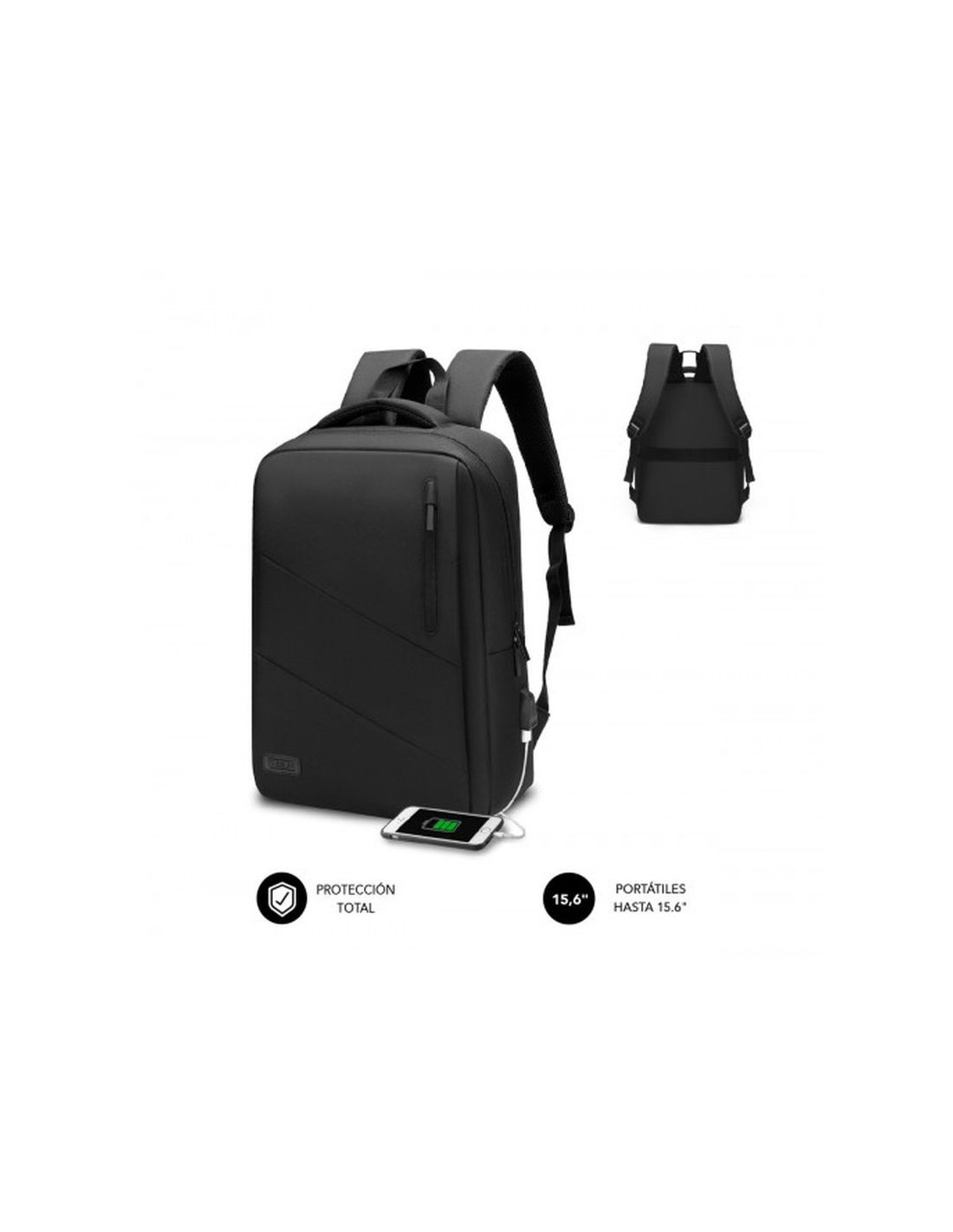 Elegante mochila para portátiles de hasta 15,6 Gran departamento con exclusivo espacio acolchado para el portátil y otros enseres como libros, cargador, etc. Dos bolsillos frontales con cremallera para accesorios ydocumentos Bolsillo en el lateral izquierdo Correas de hombro ergonómicas, acolchadas y ajustables mediante cinta regulable Asa de mano superior acolchada para un confortable transporte Espalda reforzada para una mayor comodidad Sistema de doble cremallera en el departamento principal Sistema integrado de correa para Trolley Puerto USB para carga de dispositivos La mochila para portátil Subblim City Backpack de 15,6 resulta imprescindible en todos tus viajes o desplazamientos. Facilita el transporte de tu ordenador de forma segura gracias al exclusivo compartimento acolchado así como los diferentes bolsillos para los accesorios más utilizados y documentos. Su comodidad en el transporte está asegurada gracias a sus correas para el hombro que distribuyen uniformemente el peso en la espalda así como el asa de mano acolchada. Con un diseño actual y funcional, ha sido fabricada con unos resistentes materiales que repelen el agua. Cuenta con un puerto externo de carga USB para que puedas suministrar energía a tus dispositivos. Peso 0.610 kg Dimensiones 29 × 12 × 42 cm Color Black Tamaño máx. ordenador 15,6 Cinta para Trolley Sí https://subblim.com/producto/mochila-para-portatil-city-backpack-156-black/#tab-additional_information