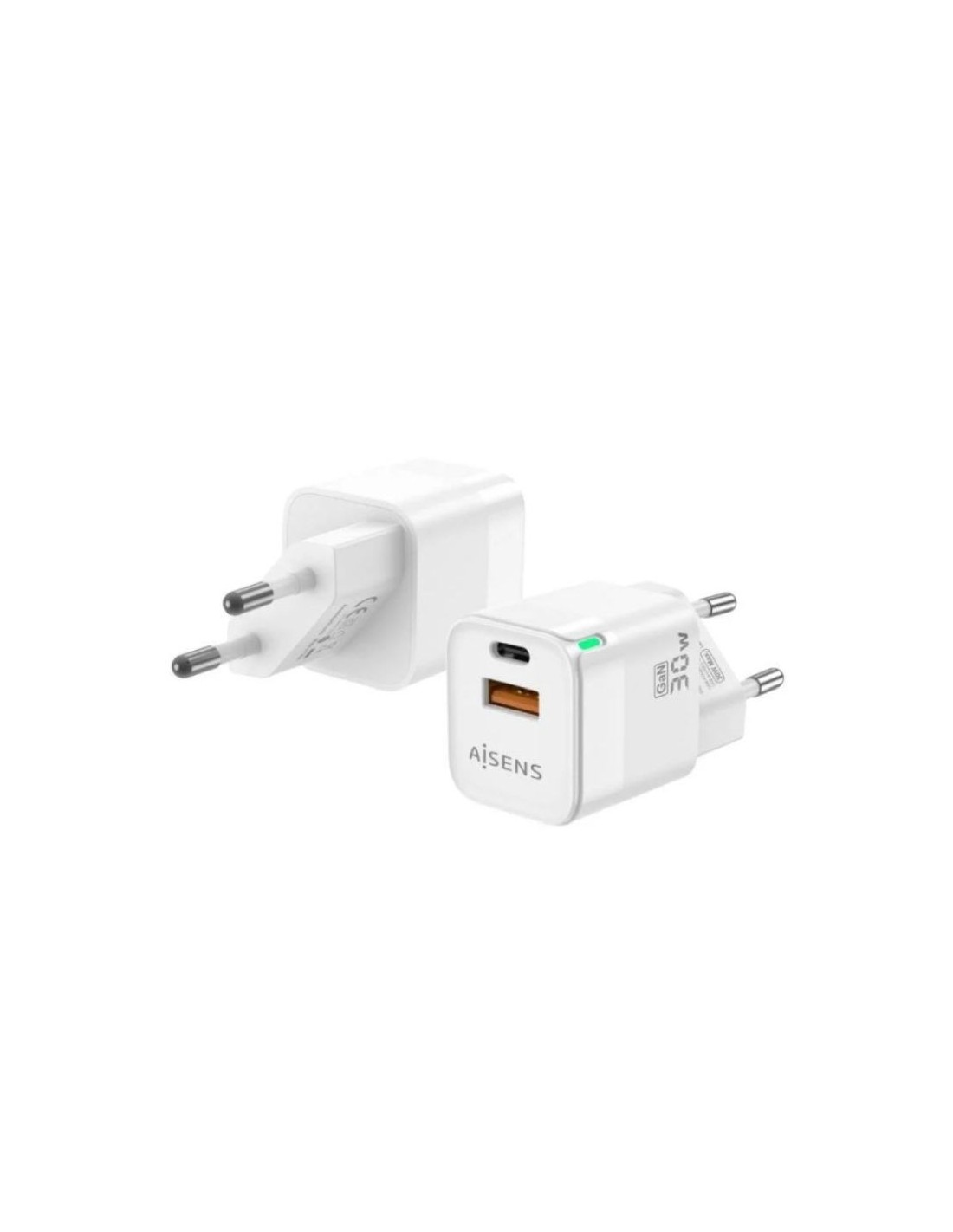 Cargador GaN USB-C 30W para cargar portátiles, móviles, cámaras y tablets etc. Diseño muy elegante, moderno y práctico. Este cargardor cuenta con la tecnología GaN que ofrece una serie de ventajas, incluyendo una mayor eficiencia energética, menor generación de calor, mayor capacidad de corriente y menor tamaño y peso en comparación con los cargadores tradicionales de silicio. Estas ventajas hacen que los cargadores GaN sean una opción cada vez más popular para usuarios que buscan una carga más rápida, eficiente y sostenible. Tecnología AI (chip inteligente) incorporado que detecta el tipo de protocolo del dispositivo conectado para maximizar tanto la compatibilidad como la velocidad de carga. Cargue su dispositivo USB-C o USB-A de forma fácil y sencilla. Múltiples protecciones contra sobrecarga, cortocircuito, lo que garantiza la máxima seguridad para su dispositivo. Este cargador puede cargar simultáneamente 2 dispositivos USB-A y USB-C a máxima velocidad. Especificaciones: Cantidad de puertos USB-C: 1 Cantidad de puertos USB-A: 1 Entrada: 100-240V 50-60Hz 0.8A Salida USB-C: 5.0V 3.0A; 9.0V 3.0A; 12.0V 2.5A; 15.0V 2.0A; 20.0V 1.5A Salida USB-A: 5.0V 3.0A; 9.0V 3.0A; 12.0V 2.25A Salida USB-C+USB-A: 5.0V 3.0A Potencia total: 30W Nivel de eficiencia: VI Compatible con la mayoria de los dispositivos USB-C o USB-A tales como portátiles, teléfonos móviles, smartphones, tablets, GPS, MP3, MP4, consolas de videojuego etc. Soporta PD3.0 para poder cargar dispositivos inteligentes con tecnología PD3.0 de forma muy rápida. Aparte de soportar protocolo PD3.0, este cargador también soporta los siguientes protocolos: PD3.0: 5V, 9V, 12V, 15V, 20V PPS: 3.3V-11V 3.0A; 3.3-16V 2.0A QC3.0 / QC4.0: 3.4V-20V QC2.0 / QC4.0: 5V, 9V, 12V, 20V HUAWEI FCP: 5V, 9V, 12V HUAWEI SCP: 3.6-5.5V SAMSUNG AFC: 9V APPLE: 5V 2.4A BC1.2: DCP 5V 1.5A Está fabricado con material ignífugo e incluye múltiples protecciones contra sobrecarga, cortocircuito, lo que garantiza la máxima seguridad para su dispositivo. Color: Blanco Normativas: RoHS, CE Test de funcionamiento: 100% testeado Contenido del paquete: 1 x Cargador GaN 30W 1 x Manual de usuario multi-idioma