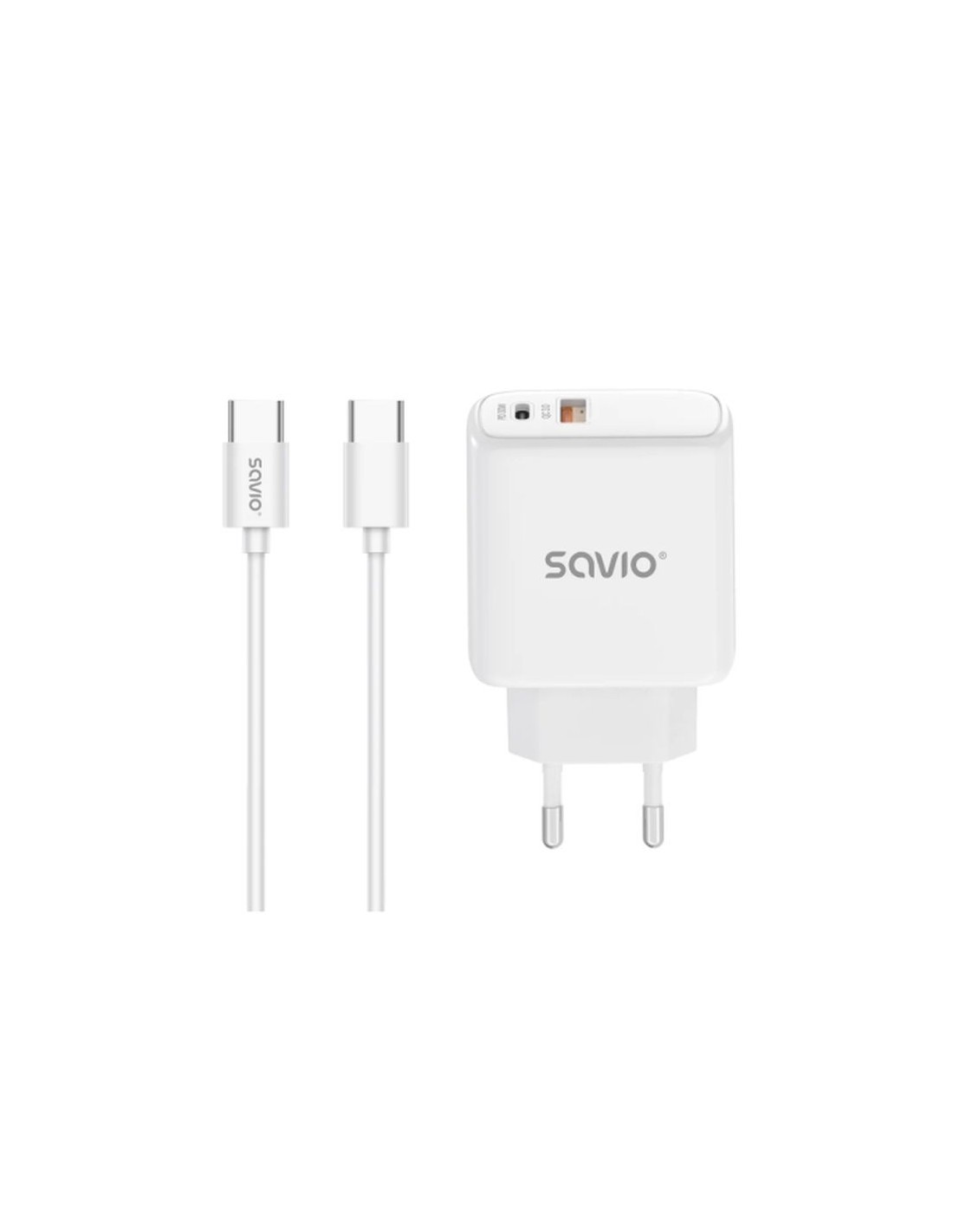 El cargador de pared LA-10 con cable no es solo un dispositivo práctico: es tu nueva forma de ahorrar tiempo y evitar frustraciones. Con carga rápida (carga rápida y carga rápida de hasta 30 W), tus dispositivos siempre estarán listos para las tareas diarias. El cable resistente de un metro incluido acaba con los enredos de cables. Y lo mejor de todo: es universal, compatible con todo, desde smartphones hasta portátiles. La combinación perfecta de comodidad y funcionalidad Siempre a mano: perfecto para una recarga rápida en la oficina, en casa o de viaje. Apoya tu día: puedes estar seguro de que tu teléfono, tableta o computadora portátil siempre estará listo para trabajar. Cero concesiones: carga rápida, segura y sin complicaciones. ¡Elige comodidad y confianza a diario! El cargador Savio LA-10 se convertirá en tu aliado diario. Especificaciones técnicas Puertos: 1 x USB-A, 1 x USB-C Voltaje de entrada: 100-240 V~, 50/60 Hz, 0,85 A Salida USB-A (QC 30W): 5 V3 A (15 W), 9 V3 A (27 W), 12 V2,5 A (30 W) Salida USB-C (PD 30W): 5 V3 A (15 W), 9 V3 A (27 W), 12 V2,5 A (30 W), 15 V2 A (30 W), 20 V1,5 A (30 W) Longitud del cable: 1 metro Dimensiones: 87 × 50 × 30 mm Protección: contra sobrecarga, cortocircuito y sobrecalentamiento Compatibilidad: con todos los teléfonos inteligentes, tabletas, etc. General Marca: SAVIO Garantía: 36 Part Number: SAVLA-10 Categorías: ACCESORIOS TELEFONÍA Reacondicionado: No Peso Volumetrico 0.12 Kg. Detalles técnicos Tipología Accesorios Telefonía: Cables Apple, Cables para teléfono, Cargadores Funciones de protección: Sobrecarga, Cortocircuitos Bluetooth: No Cantidad: 1 Número de productos incluidos: 2 pieza(s) Otras características A prueba de agua: No Conectividad Conexiones: USB A, USB C Cantidad de puertos USB 3.0: 1 Cantidad de puertos USB Type-C : 1 Longitud: 1 m Control de energía Potencia de salida: 30 W Voltaje de entrada: 100 - 240 V Color Color: Blanco