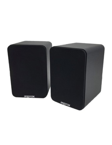 ALTAVOCES 2.0 BLUETOOTH AUTOAMPLIFICADOS APPROX APPSPK02BK 30W POR CANAL BT5.0 RCA OPTICAL COAXIAL USB INCLUYE SOPORTE PARED COLOR NEGRO . Potencia: 60 RMS (30W+30W). . Entrada: Bluetooth 5.0, RCA, optical, coaxial, USB. . Incorpora regulador trasero de volumen, bajos y agudos. . Rango de frecuencia: 40Hz-18KHz. . SNR: > = 85dB. . Mid woofer speaker: 4h 4 ¶x2. . Tweeter: 1.25h. . Mando a distancia. . Alimentacion: Voltaje 110V-250V AC 50- 60Hz. . Incluye 2 soportes de pared. . Dimensiones: 150 x 168 x 223 mm. . Color: Negro. El APPSPK02BK es una pareja de altavoces autoamplificados (activo y pasivo) con una potencia de 60W RMS y conectividad bluetooth, con carcasa de madera y un diseño muy elegante. Disfruta de una autentico sonido envolvente en cualquier espacio, salas, oficinas, establecimientos; con diferentes opciones de uso gracias a sus múltiples puertos de entrada y su sistema de transmisión inalámbrica bluetooth. Incluye soporte para su fijación a la pared.