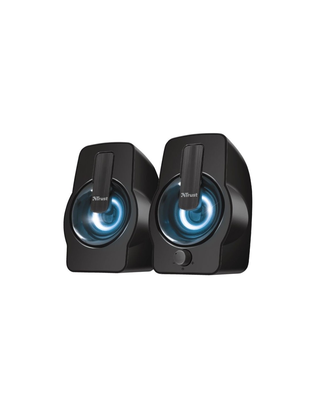 Gemi Juego de altavoces 2.0 con iluminación LED RGB Compacto juego de altavoces con un diseño elegante e iluminación LED RGB Type of speaker 2.0 Height of main product (in mm) 132 mm Width of main product (in mm) 85 mm Depth of main product (in mm) 95 mm Total weight 401 g Weight of main unit 401 g Features NFC no Hands-free phone calls no Tripod mount no Special features RGB lights Power saving no Control Remote control no Controls volume, on/off Connectivity Connection type wired Bluetooth no Cables included fixed on speaker Cable length power cable 140 cm Cable length audio cable 140 cm Cable length satellite cable 90 cm Audio Power output (peak) 12 W Power output (RMS) 6 W Frequency response 20 Hz - 20000 Hz Driver size 40 mm Driver units 2 Audio input 3.5 mm Headphone connection no Microphone built-in no Microphone connection no Lighting Lights yes Light type LED Light modes Random Protection Waterproof no Power Power cable detachable no Input Power source USB Compatibility Compatible Device Types pc, laptop General compatibility pc with 3.5mm audio output and USB port Compatible Consoles no Satellites Satellite Height (mm) 132 mm Satellite Width (mm) 85 mm Satellite Depth (mm) 95 mm información extra Número de referencia 22948 Código EAN 8713439229486 Garantía 2 años Contenido del paquete Juego de altavoces con cables incluidos Manual del usuario Requisitos del sistema Conexión de audio de 3,5 mm Puerto USB (para alimentación) https://www.trust.com/es/product/22948-gemi-rgb-2-0-speaker-set-black#product-specifications