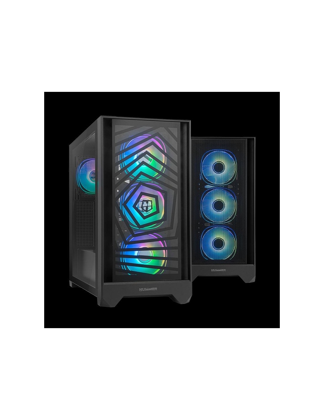 Prestaciones + Dos paneles frontales incluidos (cristal templado diseño exclusivo y mesh) 4 ventiladores Hummer ARGB incluidos Lateral de cristal templado Espacio para instalar hasta 7 ventiladores USB 3.0 y USB Type-C de alta velocidad Compatible con tarjetas gráficas de hasta 400 mm Filtro antipolvo magnético superio Tipo chasis + Semitorrer Placa base + ATX | M-ATX | ITX Bahías internas + 2 x 3.5; 1 x 2.5 Sistema de ventilación + Frontal: 3x 120 mm Hummer ARGB (incluidos) Trasero: 1x 120 mm Hummer ARGB (incluido) Superior: 3x 120 o 2x 140 mm (no incluidos) Opciones refrigeración líquida + Frontal: 120 / 240 mm Trasero: 120 mm Superior: 120 / 240 / 280 / 360 mm Espacio + Cooler CPU 185 mm Tarjeta gráfica 400 mm Gestión cableado 40 mm Fuente de alimentación 180 mm Especificaciones generales + Material · Chasis de acero SPCC 0.8 y 0.6 mm · Frontal y lateral de cristal templado · Lateral metal mesh Puertos 2x USB 3.0 | 1x USB Type-C | HD Audio | Mic Slots expansión 7 Color Negro Fuente de alimentación Estándar ATX compatible (no incluida) Dimensiones 230 x 456 x 485 mm (W x H x L) Peso 8.5 Kg