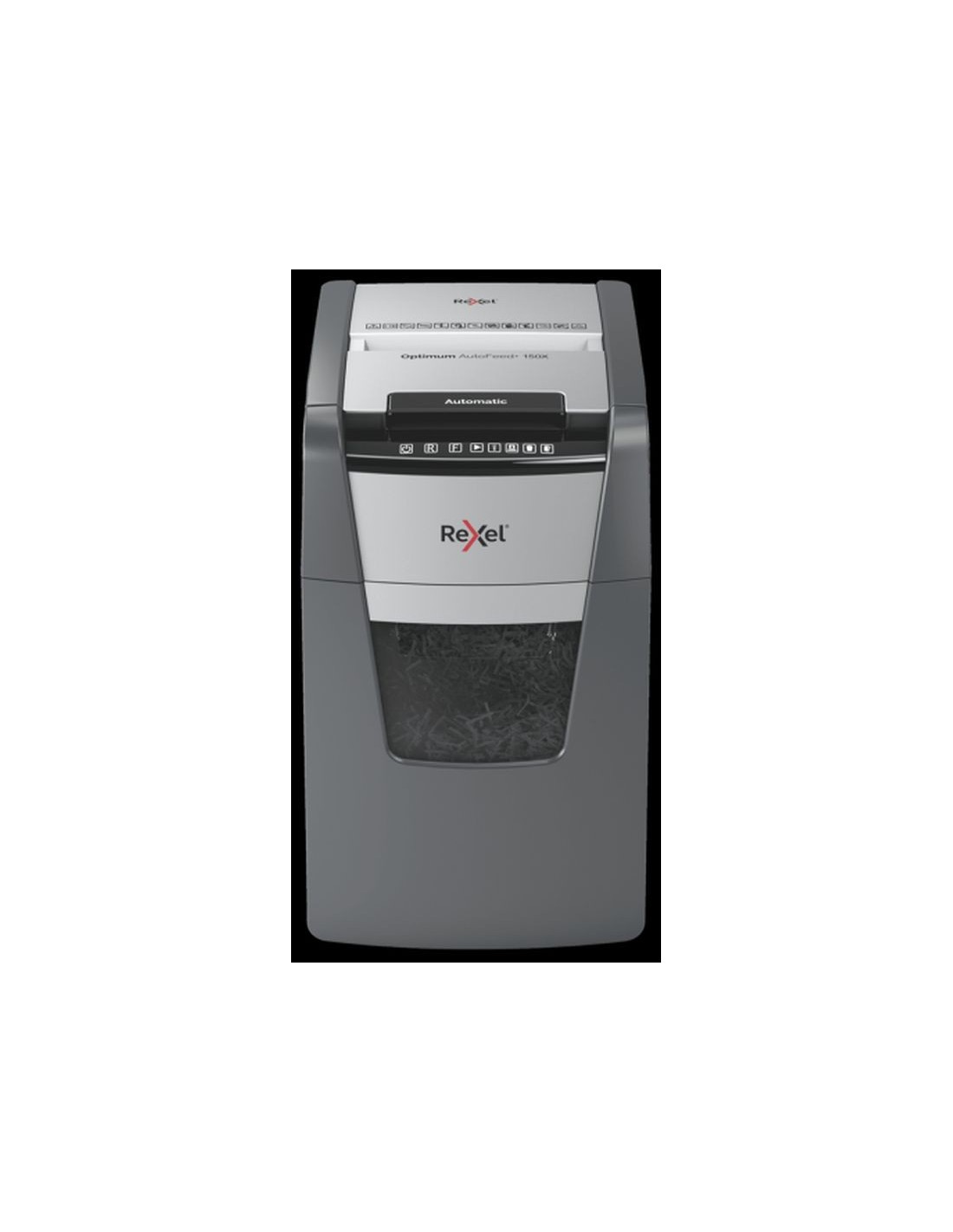 Destructora automtica Rexel Optimum AutoFeed 150X de corte en partculas La destructora de corte en partculas Optimum AutoFeed 150X tritura automticamente hasta 150 hojas de papel A4 (80 grs.) a la vez, en partculas P-4 (4x28 mm). Esta destructora de alimentacin automtica es una trituradora de oficina sofisticada, con una papelera extrable de 44 litros. No es necesario alimentar manualmente el papel, ni quitar grapas y clips de papel primero, esta destructora de papel automtica har todo el trabajo por ti. Caractersticas Alimentacin automtica de hasta 150 hojas de papel A4 (80 grs.) a la vez. Ranura manual hasta 8 hojas. Corte en partculas P-4 (4x28mm). Papelera extrable con capacidad para 44l. Tecnologa anti atascos. Destruye tarjetas de crdito, grapas y clips. 30 minutos de tiempo de funcionamiento continuo con enfriamiento del ventilador. El modo de suspensin se activa despus de 3 minutos sin uso. Panel de control tctil. Nivel de ruido ultra silencioso de 55 dBA. Sensor de compartimento lleno con infrarrojos. Garanta de 2 aos, garanta de ctter de 2 aos. Especificaciones Referencia 2020150XEU Color Negro Dimensiones 365 x 618 x 430 Tiempo de funcionamiento desde fro 30 Periodo de garanta 2 aos Mxima amplitud de entrada (mm) 220 Capacidad de corte (hojas 80 grs) Alimentacin automtica 150 hojas (mx.). Ranura manual de hasta 8 hojas (80 grs.). Tipo de corte Corte en partculas Capacidad de la papelera en l 44 Material destruido Tarjetas de crdito, grapas y clips. Peso 15,34 https://www.rexeleurope.com/es-es/products/destructoras-de-papel/rexel-destructoras-de-alimentaci%C3%B3n-autom%C3%A1tica-manos-libres/destructora-autom%C3%A1tica-rexel-optimum-autofeed-150x-de-corte-en-part%C3%ADculas_2020150xeu/
