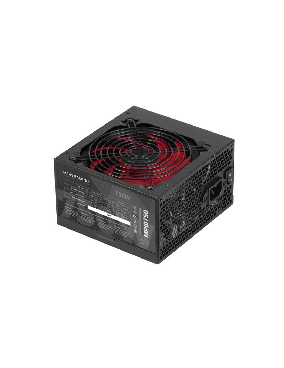 FUENTE DE ALIMENTACION TACENS MARS GAMING MPIII 750W, EFICIENCIA 85% PFC ACTIVO VENT 12x12 14db HASWELL DESTINADA PARA REPARACIONES CARACTERÍSTICAS TÉCNICAS- Dimensiones: 150x145x85mm Peso: 1300g Tipo cableado: Fijo Acabado cableado: Planos Ventilador: 120mm Color: Negro y Rojo Extras: Cables planos extra largos Potencia: 750W Corriente máx: 7A Voltaje de entrada: 200-240V 50/60Hz PFC: Activo Eficiencia: >85% Nivel sonoro: 14dB Factor de forma: ATX Certificaciones: ATX12V, Haswell Ready, CE, ROHS Protecciones: OPP, OVP, UVP, SCP Conectores: 1x ATX MB 20+4 PIN · 1x EPS +12V 4+4 PIN · 6x SATA · 4x Molex 4 PIN · 2x PCIe 6+2 PIN Voltaje / Corriente: +3.3V - 25A / +5V - 27A / +12V - 50A / -12V - 0.5A / +5VSB - 2.5A Su fabricación ultra estable SMD sobre un PCB de doble capa de fibra de vidrio, asegura un rendimiento y fiabilidad extremos ante cualquier circunstancia. Además, la MPIII750 integra los más avanzados y completos sistemas de seguridad electrónicos: OVP (protección exceso voltaje), UVP (protección déficit voltaje), OCP (protección exceso eléctrico), OPP (protección exceso potencia) y SCP EXTENDED (protección total cortocircuitos internos y externos). La MPIII750 ha sido desarrollada en Europa y fabricada bajo los más estrictos estándares europeos. Equipada con la última tecnología en control de ventiladores AI-RPM ideal para garantizar un funcionamiento sin ruido, la MPIII750 cuenta con control térmico inteligente de última generación basado en algoritmos avanzados y sistemas de control multinivel para mantener el ventilador al mínimo. Además, la MPIII750 cuenta con un ventilador de grado industrial con rodamiento de fluido dinámico y motor extra grande para maximizar su estabilidad. Toda la tecnología disponible para asegurar el mínimo ruido y la máxima eficiencia y durabilidad. Con una eficiencia del 99% en el sistema DIGITAL APFC y un 85% de eficiencia eléctrica lograrás un perfecto equilibrio entre eficiencia y consumo. Además, su tecnología de raíl único +12v te permitirá instalar el hardware más exigente. Los cables de la MPIII750 son planos, negros y extra largos: una combinación de prestaciones que hacen su instalación no solo más fácil que nunca sino, además, totalmente versátil para cualquier montaje en cualquier tipo de caja https://es.marsgaming.eu/es/fuentes-de-alimentacion/fuente-de-alimentacion-mpiii750_mpiii750