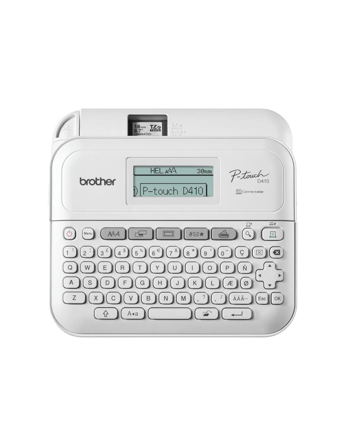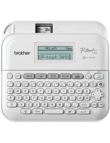 PT-D410 Rotuladora electrónica de sobremesa con teclado y conexión a PC Especificaciones General - P-touch Tipo Sobremesa, Con conexión a PC Ancho máximo de cinta (mm) 18 Tipo de uso Oficina Autoapagado Sí Tipo de cortador Manual Pantalla Pantalla LCD Diseño de la carcasa Sobremesa Tipo de teclado QWERTY Ubicaciones de la memoria 50 Número de teclas 65 Tecnología Transferencia térmica Configuración de unidad (mm / pulgadas) Sí Pilas alcalinas 6 Pilas AA alcalinas/recargables (LR6/HR6) Tamaño de pantalla 16 caracteres x 2 líneas Idiomas Inglés, alemán, francés, español, portugués, italiano, holandés, danés, noruego, sueco, finés, húngaro, checo, polaco, rumano, esloveno, eslovaco, croata, turco, portugués de Brasil General - Consumibles Ancho 3.5mm,6mm,9mm,12mm,18mm Tipo Cintas TZe Conectividad Interfaz USB Sí Dimensiones y pesos Dimensiones sin caja 187mm (An) x 178mm (F) x 72mm (Al) Peso 0,76 kg Incluye Casetes de cinta Cinta laminada 18mm x 4m (negro sobre blanco) Cable USB Sí Guía de usuario Sí Tarjeta de garantía Sí Guía de configuración rápida Sí Sistemas operativos y software Macintosh Mac OS X 10.15.x o superior, Mac OS X 11 x o superior Windows Windows Vista, Windows 7, Windows 8 Diseño de etiquetas Fuentes 15 Marcos 120 Formato de línea Sí Símbolos 700 Alineación de texto Centrar, Justificar, Izquierda, Derecha Subrayado Sí Impresión vertical Sí Impresoras de etiquetas Impresión reflejada Sí Diseños de etiquetas predefinidos Función de marcado de cables Sí Consumibles y accesorios Anchos de cinta 3.5mm,6mm,9mm,12mm,18mm Garantía Garantía Cuando adquieres un equipo de impresión o digitalización Brother, estás llevándote un equipo con 3 años de garantía. Si eres empresa o profesional, para acceder al tercer año de garantía comercial es necesario que registres tu equipo en nuestra página web, en el plazo máximo de 45 días desde la fecha de compra que aparece en la factura. https://www.brother.es/impresoras-etiquetas-y-recibos/pt-d410