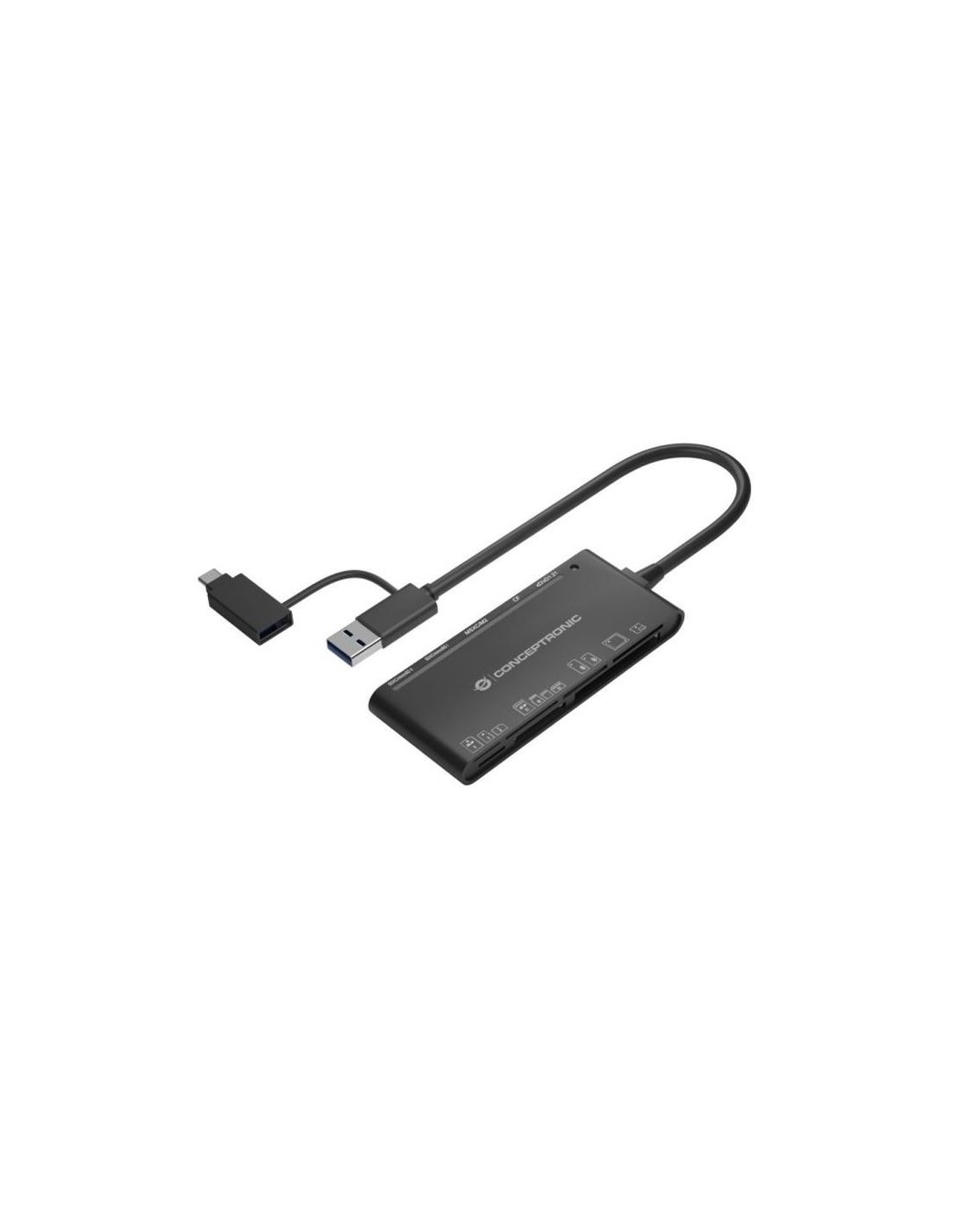 Card Reader Externo Usb-c/ Usb-a 7en1 Conceptronic Bian03b Usb 3.0 Sd/sdhc/sdxc Mmc Ms M2 Ct Xd Microsd/tflash Conceptronic StreamVault BIAN03B, CF, MMC, MS Micro (M2), Memoria extraíble, MicroSD (TransFlash), MicroSDHC, MicroSDXC, SD, SDHC,..., Negro, 5000 Mbit/s, USB 3.2 Gen 1 (3.1 Gen 1) Type-A, 46 mm, 110 mm Desempeño Tarjetas de memoria compatibles CF, MMC, MS Micro (M2), Memoria extraíble, MicroSD (TransFlash), MicroSDHC, MicroSDXC, SD, SDHC, SDXC, xD Número de ranuras para tarjeta de memoria 7 Interno No Velocidad de transferencia de datos 5000 Mbit/s Color del producto Negro Conectar y usar (Plug and Play) Si Indicadores LED Si Puertos e Interfaces Tipo de interfaz USB 3.2 Gen 1 (3.1 Gen 1) Type-A Peso y dimensiones Ancho 46 mm Profundidad 110 mm Altura 12 mm Peso 58 g Empaquetado Cantidad por paquete 1 pieza(s) Ancho del paquete 108 mm Profundidad del paquete 173 mm Altura del paquete 23 mm Peso del paquete 83 g Contenido del embalaje Guía de configuración rápida Si Detalles técnicos País de origen China https://www.conceptronic.net/conceptronic_en/bian03b-7-in-1-usb-3-0-card-reader-2-in-1-usb-c-usb-a-cable-sd-sdhc-sdxc-x-2-micro-s