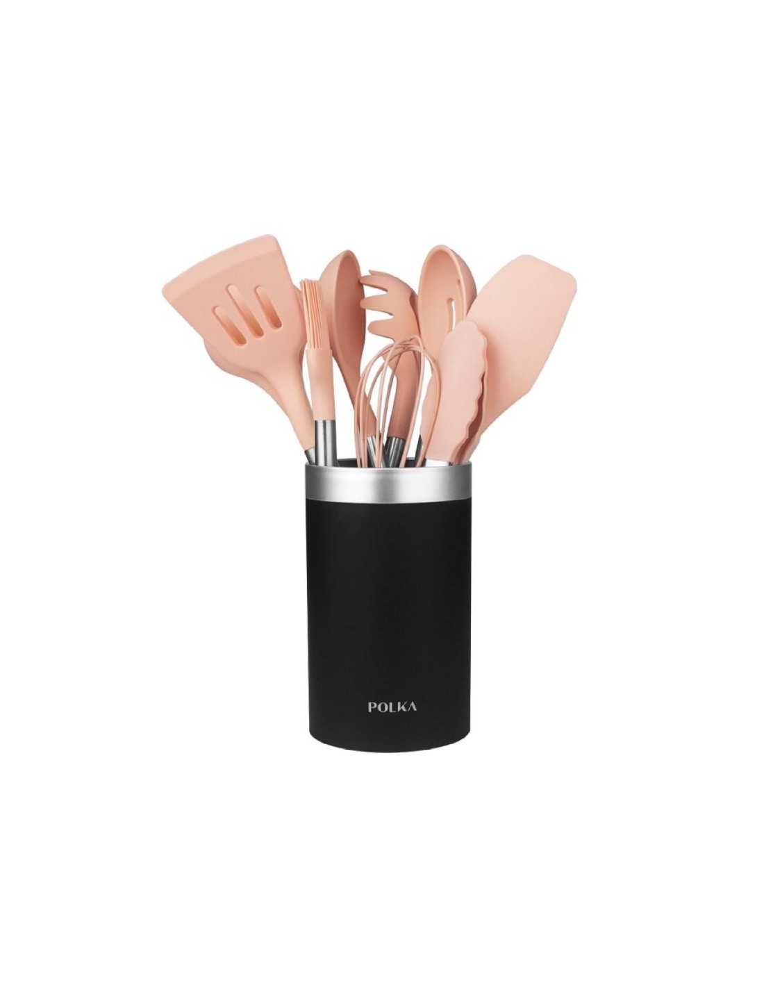 Set de 9 utensilios, con cabezal de color rosa pastel, recubierto por soft touch y mango de acero. Los materiales principales consisten en silicona, nylon y PP. Como accesorio, este set incluye un holder de Polka.