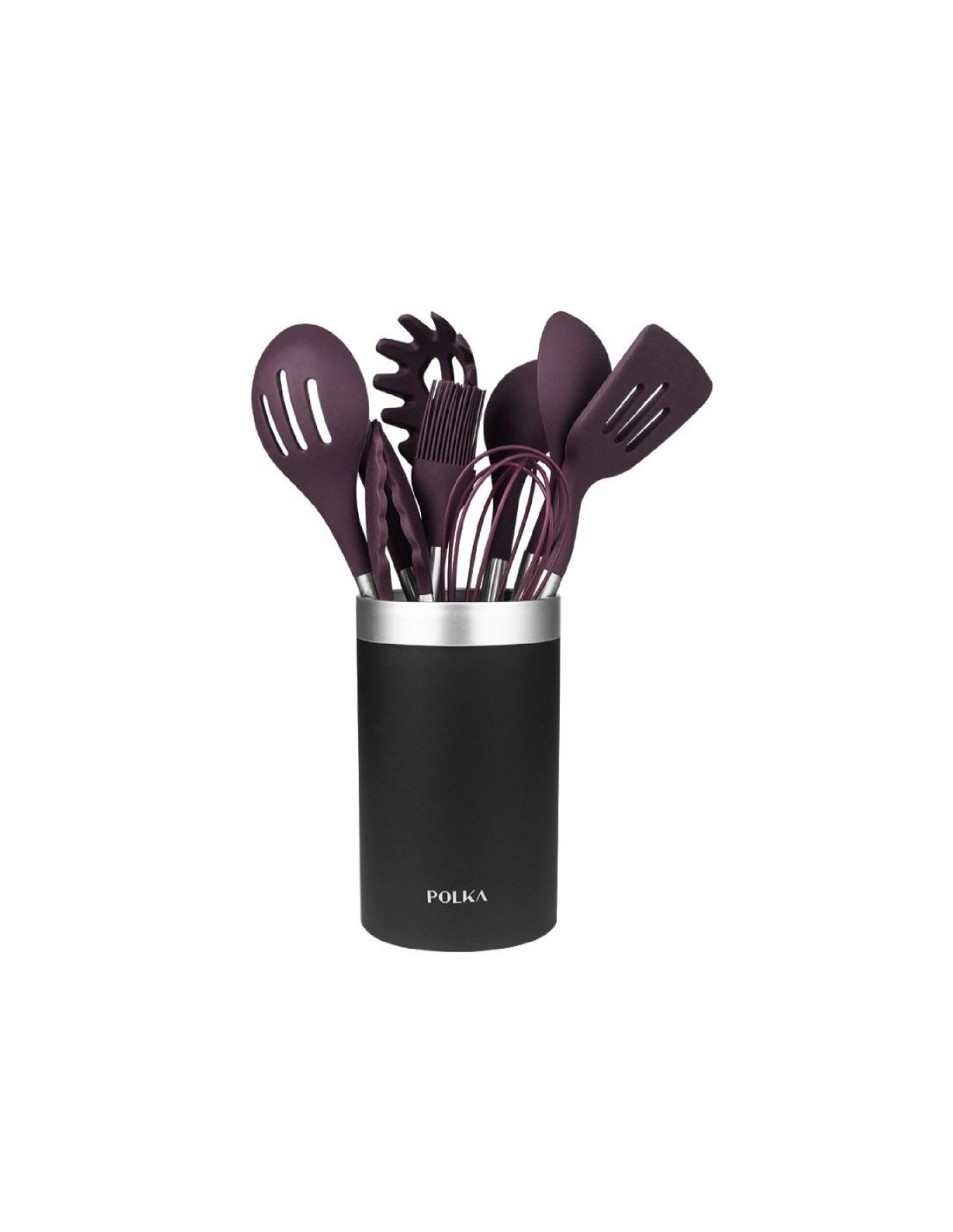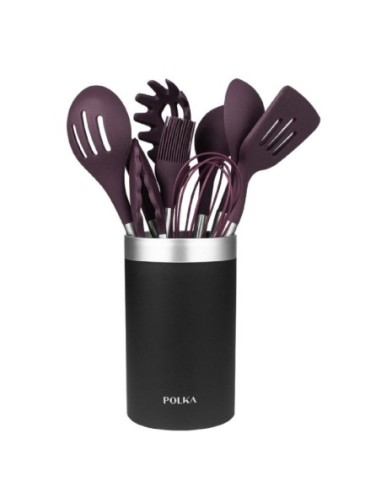 Set de 9 utensilios, con cabezal de color morado, recubierto por soft touch y mango de acero. Los materiales principales consisten en silicona, nylon y PP. Como accesorio, este set incluye un holder de Polka.