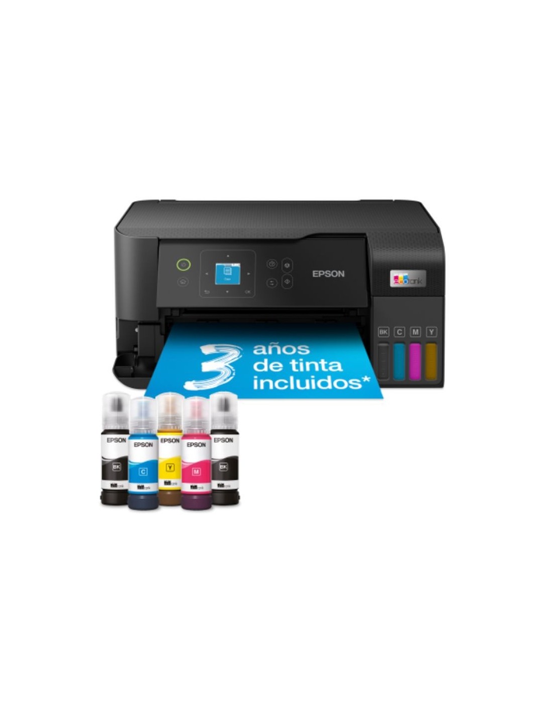 Tecnología Método de impresión Cabezal de impresión PrecisionCore Configuración inyectores 400 Inyectores negro, 128 Inyectores por color Tamaño máximo gota 3,3 pl, Con tecnología de gotas de tinta de tamaño variable Tecnología de tinta Dye Ink Resolución de impresión 4.800 x 1.200 ppp Multifunción Impresión, Escanear, Copia Impresión Number of colours 4 colores Velocidad de impresión ISO/IEC 24734 15 páginas/minuto Monocromo, 8 páginas/minuto Color Velocidad de impresión 33 páginas/minuto Monocromo (Papel Normal 75 g/m²), 20 páginas/minuto Color (Papel Normal 75 g/m²) Tiempo de salida de primera página Monocromo 9 segundos, Color 15 segundos Colores Negro [Dye], Cian [Dye], Amarillo [Dye], Magenta [Dye] Colours Capacity Black [65ml], Cyan [65ml], Yellow [65ml], Magenta [65ml] Escaneado Velocidad de escaneado a una cara (A4 en negro) 11 sec. with flatbed scan Velocidad de escaneado a una cara (A4 a color) 28 sec. with flatbed scan Resolución de escaneado 1.200 ppp x 2.400 ppp (horizontal × vertical) Formatos de salida BMP, JPEG, PICT, TIFF, TIFF múltiple, PDF, PNG, PDF multi Tipo de escáner Sensor de imagen de contacto (CIS) Manejo de papel y sustratos Número de bandejas de papel 1 Formatos papel A4 (21.0x29,7 cm), A5 (14,8x21,0 cm), A6 (10,5x14,8 cm), B5, B6, C6 (sobre), DL (sobre), No. 10 (sobre), 100 x 148 mm, 10 x 15 cm, 13 x 18 cm, 9 x 13 cm, 16:9 Dúplex Manual Capacidad de la bandeja de salida 30 Hojas Paper Tray Capacity 100 Hojas Estándar Peso del papel adecuado 64 g/m² - 300 g/m² Gestión de soportes Impresión sin bordes (hasta 10 x 15 cm) General Número recomendado de usuarios Desde 1 a 2 consumo de energía 12 vatio (copia autónoma, norma ISO/IEC 24712), 0,8 vatio (modo de ahorro), 5,4 vatio Preparado, 0,2 vatio (desconectar), TEC 0,19 kWh/week Voltaje de suministro AC 100 V - 240 V, 50 Hz - 60 Hz Dimensiones del producto 375? x 347 x 179 mm (ancho x profundidad x altura) Peso 4,1 kg nivel de ruido 5,1 B (A) con Epson Premium Glossy Photo Paper / modo Photo RPM. - 41 dB (A) con Epson Premium Glossy Photo Paper / modo Photo RPM. Sistemas operativos compatibles Mac OS X 10.9.5 or later, Windows 10 (32/64 bit), Windows 11 or later, Windows 7 (32/64 bit), Windows 8 (32/64 bits), Windows 8.1 (32/64 bit), Windows Server 2008 (32/64 bits), Windows Server 2008 R2, Windows Server 2012 R2, Windows Server 2016, Windows Vista (32/64 bits), Windows XP Professional x64 Edition SP2 or later, Windows XP SP3 or later (32-bit), Windows Server 2003 R2, Windows Server 2003 SP2 or later, macOS 11 or later Interfaces USB, Wi-Fi, Wi-Fi Direct Seguridad WLAN WEP 64 bits, WEP 128 bits, WPA PSK (TKIP), WPA2 PSK (AES), WPA3-SAE(AES) Servicios de impresión móvil y en nube Apple AirPrint, Epson Smart Panel App, Epson Connect (Email Print, Remote Print Driver) Alimentación 220 V, 240V Colour Black Otras funciones Pantalla LCD Tipo: Color, Diagonal: 3,7 cm Otros Garantía 12 meses Reparación en taller, 50.000 páginas Rendimiento de la botella incluida Rendimiento de la tinta negra 6.600 páginas Rendimiento del color 5.900 páginas