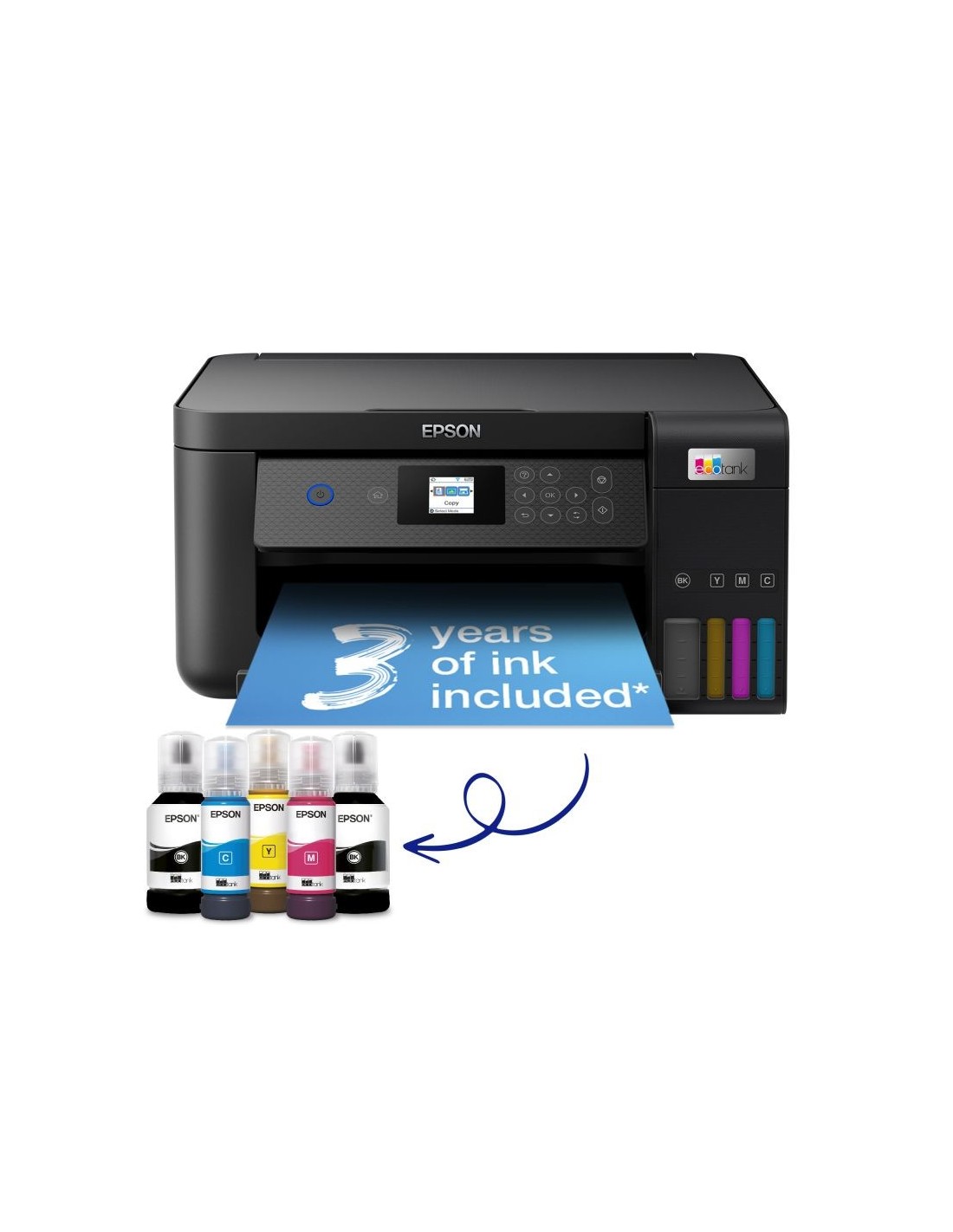 CARACTERÍSTICAS Marca:Epson Familia de productos: EcoTank Nombre de producto: EcoTank ET-2850 Código del producto: C11CJ63405 Código EAN/UPC: 8715946686370 Di adiós a los cartuchos EcoTank proporciona una solución sin complicaciones para la impresión en casa: los depósitos de tinta de ultraalta capacidad están diseñados para recargas limpias con botellas que incluyen una función de bloqueo que solo permite rellenar cada depósito con el color correcto. No dejes de ahorrar Esta impresora económica te permite ahorrar hasta un 90 % en costes de impresión1 y se suministra con una botella de tinta negra adicional para hasta 3 años de impresiones2. Un solo juego de botellas de tinta permite imprimir hasta 7500 páginas en negro y 6000 en color3, lo que equivale hasta a 72 cartuchos de tinta1 Aplicación Epson Smart Panel Esta aplicación te permite controlar tu impresora desde un dispositivo inteligente4. Puedes imprimir, copiar y escanear documentos y fotos, configurar, supervisar y solucionar problemas de tu impresora, así como dejar volar tu creatividad con una amplia gama de plantillas artísticas. Repletas de funciones Con una pantalla LCD a color de 3,7 cm, impresión automática a doble cara, impresión fotográfica sin bordes y velocidades de impresión de hasta 10,5 páginas por minuto5, puedes llevar a cabo una amplia variedad de tareas con facilidad a gran velocidad. Flexible y moderna Su diseño compacto y la conectividad Wi-Fi y Wi-Fi Direct completa, te permiten integrar fácilmente esta impresora con la configuración de tu hogar e imprimir desde móviles, tablets y ordenadores portátiles4. Tecnología sin calor Con la Tecnología Sin Calor Micro Piezo puedes disfrutar de un consumo energético reducido y menos necesidad de piezas de repuesto. El cabezal de impresión también viene preinstalado, por lo que la configuración de tu impresora no supone ningún problema. Velocidad de la impresión Modo de impresión a doble cara Auto Tecnología de impresión Inyección de tinta Impresión Impresión a color Impresión dúplex Resolución máxima 5760 x 1440 DPI Velocidad de impresión (negro, calidad normal, A4/US Carta) 33 ppm Velocidad de impresión (color, calidad normal, A4/US Carta) 15 ppm Velocidad de impresión (ISO/IEC 24734) en negro 10,5 ppm Velocidad de impresión (ISO/IEC 24734) en color 5 ppm Velocidad de impresión dúplex (ISO/IEC 24734, A4) negro 6 ppm Velocidad de impresión dúplex (ISO/IEC 24734, A4) color 4 ppm Tiempo hasta primera página (negro, normal) 10 s Tiempo hasta primera página (color, normal) 16 s Impresión sin bordes Copiado Copia a doble cara Modo de impresión dúplex Auto Copiando Copia a color Exploración Escaneando Escaneo a color Resolución óptica de escáner 1200 x 2400 DPI Tipo de escaneado Escáner de cama plana Tecnología de escaneado CIS Escanear a Nube Velocidad de escaneo (color) 28 ppm Formatos de imagen soportados BMP, JPEG, PICT, TIFF, PNG Formatos de texto soportados PDF Fax Enviando por fax Características Ciclo de trabajo (máximo) 30000 páginas por mes Funciones dúplex Copiar, Imprimir, Escanear Número de cartuchos de impresión 4 Colores de impresión Negro País de origen Filipinas Capacidad de entrada y salida Número total de bandejas de entrada 1 Capacidad de entrada total 100 hojas Capacidad de salida total 30 hojas Bandeja multifunción Capacidad de entrada de bandeja multiuso 100 hojas Dirección de papel Tamaño máximo de papel ISO A-series A4 Tipos de papel Papel fotográfico, Papel normal ISO tamaño de serie A (A0...A9) A4, A5, A6 ISO tamaño de serie B (B0...B9) B5, B6 ISO tamaño de serie C (C0...C9) C6 Tamaño de sobres 10, C6, DL Tamaño de papel fotográfico 9x13, 10x15, 13x18, 13x20, 20x25 Puertos e Interfaces Puerto USB Conexión Wifi Algoritmos de seguridad soportados 64-bit WEP, 128-bit WEP, WPA-PSK, WPA-TKIP, WPA2-PSK, WPA2-AES Tecnología de impresión móvil Apple AirPrint Diseño Color del producto Negro Posicionamiento de mercado Hogar y oficina Pantalla incorporada Pantalla LCD Diagonal de la pantalla 3,81 cm (1.5) Pantalla a color Control de energía Consumo de energía (media de funcionamiento) 12 W Consumo de energía (ahorro) 0,7 W Consumo de energía (copiando) 12 W Consumo de energía (preparado) 4,3 W Consumo de energía (apagado) 0,2 W Enery Star Consumo Electrico Típico (TEC) 0,14 kWh/semana Voltaje de entrada AC 220 - 240 V Frecuencia de entrada AC 50/60 Hz Requisitos del sistema Sistema operativo Windows soportado Windows 10, Windows 10 x64, Windows 7, Windows 7 x64, Windows 8, Windows 8 x64, Windows 8.1, Windows 8.1 x64, Windows Vista, Windows Vista x64, Windows XP Professional x64 Sistema operativo MAC soportado Mac OS 8.0, Mac OS X 10.0 Cheetah