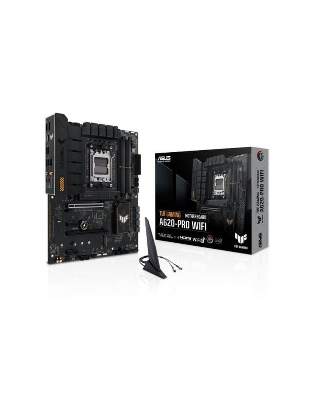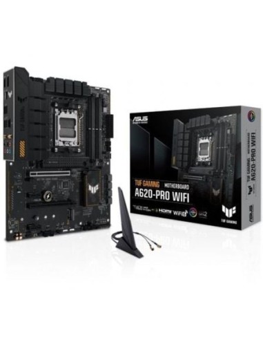 TUF GAMING A620-PRO WIFI ASUS TUF GAMING A620-PRO WIFI toma todos los elementos esenciales de los procesadores AMD Ryzen serie 7000 y los combina con funciones listas para jugar y una durabilidad probada. Diseñada con componentes de grado militar, una solución de alimentación mejorada y un completo sistema de refrigeración, esta placa base supera las expectativas con un rendimiento sólido como una roca y estable para juegos maratonianos. Las placas base TUF GAMING también se someten a rigurosas pruebas de resistencia para garantizar que pueden soportar condiciones en las que otras podrían fallar. Estéticamente, este modelo incorpora resistentes elementos de diseño geométrico y negro apagado para reflejar la fiabilidad y estabilidad que definen a la serie TUF GAMING. CONTROL INTELIGENTE Los controles integrales son la base de la serie ASUS TUF GAMING. La placa base TUF GAMING A620 incorpora herramientas flexibles para ajustar cada aspecto de tu sistema, lo que permite realizar ajustes de rendimiento que se adapten perfectamente a tu forma de trabajar para maximizar la productividad. Eficiencia energética integral La función Ahorro de energía contiene varios ajustes que pueden optimizar fácilmente el consumo de energía y maximizar el ahorro energético. Puedes activar un límite de potencia de la CPU, oscurecer la iluminación Aura y ajustar el perfil del ventilador a un modo de ahorro de energía. También puedes activar el plan de Ahorro de Energía integrado en Microsoft Windows Rendimiento sólido como una roca Con una entrega de potencia mejorada y amplias opciones de refrigeración para alimentar las CPU de AMD, además de compatibilidad con memoria y almacenamiento más rápidos, las placas base TUF GAMING A620 son la base perfecta para tu próximo equipo de batalla AMD de alto número de núcleos. Etapas de potencia DrMOS las etapas de potencia 12+2 están preparadas para manejar 50 amperios cada una, combinando MOSFETS y controladores de lado alto y bajo en un único paquete para ofrecer potencia, eficiencia y rendimiento estable para todos los procesadores AMD compatibles. Bricolaje fácil para PC La línea TUF GAMING ofrece una configuración sencilla para todos los constructores. El ecosistema TUF GAMING Alliance garantiza la compatibilidad, mientras que Armoury Crate dispone de Fan Xpert 4, información de hardware, cancelación del ruido AI bidireccional, opciones RGB y ajustes de periféricos. Esta plataforma dispone de herramientas intuitivas para construir y optimizar plataformas de ensueño Construye con confianza TUF GAMING Alliance es una colaboración entre ASUS y marcas de componentes de PC de confianza para garantizar la compatibilidad de una amplia gama de piezas, como carcasas de PC, fuentes de alimentación, disipadores de CPU, kits de memoria y mucho más. Con las nuevas asociaciones y componentes que se añaden regularmente, la Alianza TUF GAMING seguirá fortaleciéndose aún más Juego inmersivo Las placas base TUF GAMING A620 proporcionan un paquete de juego de alto rendimiento repleto de funciones, con una red ultrarrápida para un juego en línea más fluido, un audio impecable con señales posicionales para juegos FPS, y una iluminación RGB integrada que se sincroniza con el equipo conectado para personalizar tu ambiente de juego. Especificaciones Modelo TUF GAMING A620-PRO WIFI CPU Socket AM5 de AMD para procesadores de escritorio AMD Ryzen de las series 9000, 8000 y 7000* * Consulta www.asus.com para ver la lista de CPU compatibles. Conjunto de chips Conjunto de chips AMD A620 Memoria 4 ranuras DIMM, máx. 192 GB, DDR5 7600+(OC)/7200(OC)/7000(OC)/6800(OC)/6600(OC)/6400(OC)/6200(OC)/6000(OC)/5800(OC)/5600(OC)/5400(OC)/5200/5000/4800 Memoria sin búfer, ECC y no ECC* Arquitectura de memoria de canal dual Compatible con perfiles extendidos de AMD para overclocking (EXPO) OptiMem II * Los tipos de memoria compatibles, la velocidad de datos y la cantidad de módulos DRAM varían según la configuración de la CPU y la memoria. Para obtener más información, consulte la lista de compatibilidad de CPU/memoria en la pestaña de compatibilidad del sitio de información del producto o visite https://www.asus.com/support/. * La memoria DDR5 sin búfer y sin ECC admite la función On-Die ECC. Gráficos 1 x DisplayPort** 1 x puerto HDMI*** * Las especificaciones gráficas pueden variar entre los tipos de CPU. Consulta las especificaciones de CPU de AMD. ** Admite un máximo de 8K a 60 Hz, como se especifica en DisplayPort 1.4. *** Admite 4K a 60 Hz, como se especifica en HDMI 2.1. Ranuras de expansión Procesadores de escritorio AMD Ryzen serie 9000 y 7000* 1 ranura PCIe 4.0 x16 (compatible con el modo x16) Procesadores de escritorio AMD Ryzen serie 8000 1 ranura PCIe 4.0 x16 (compatible con el modo x8/x4)** Chipset AMD A620 1 ranura PCIe 3.0 x16 (compatible con el modo x2)*** 2 ranuras PCIe 3.0 x1 * Consulte la tabla de bifurcación de PCIe en el sitio de soporte (https://www.asus.com/support/FAQ/1037507/). ** Las especificaciones varían según los tipos de CPU. *** La ranura PCIEX16_2 se deshabilitará cuando se ocupe cualquiera de las ranuras PCIEX1. - Para garantizar la compatibilidad del dispositivo instalado, consulte https://www.asus.com/support/ para obtener la lista de periféricos compatibles. Almacenamiento Total admite 2 ranuras M.2 y 4 puertos SATA de 6 Gb/s* Procesadores de escritorio AMD Ryzen serie 9000 y 7000 Ranura M.2_1 (Key M), tipo 2242/2260/2280 (compatible con el modo PCIe 4.0 x4) Ranura M.2_2 (Key M), tipo 2242/2260/2280/22110 (compatible con el modo PCIe 4.0 x4) Procesadores de escritorio AMD Ryzen serie 8000 Ranura M.2_1 (Key M), tipo 2242/2260/2280 (compatible con el modo PCIe 4.0 x4) Ranura M.2_2 (Key M), tipo 2242/2260/2280/22110 (compatible con PCIe 4.0 x4/x2 Modo de almacenamiento)** Chipset AMD A620 4 puertos SATA de 6 Gb/s * La tecnología AMD RAIDXpert2 es compatible con PCIe RAID 0/1/10 y SATA RAID 0/1/10. ** Las e