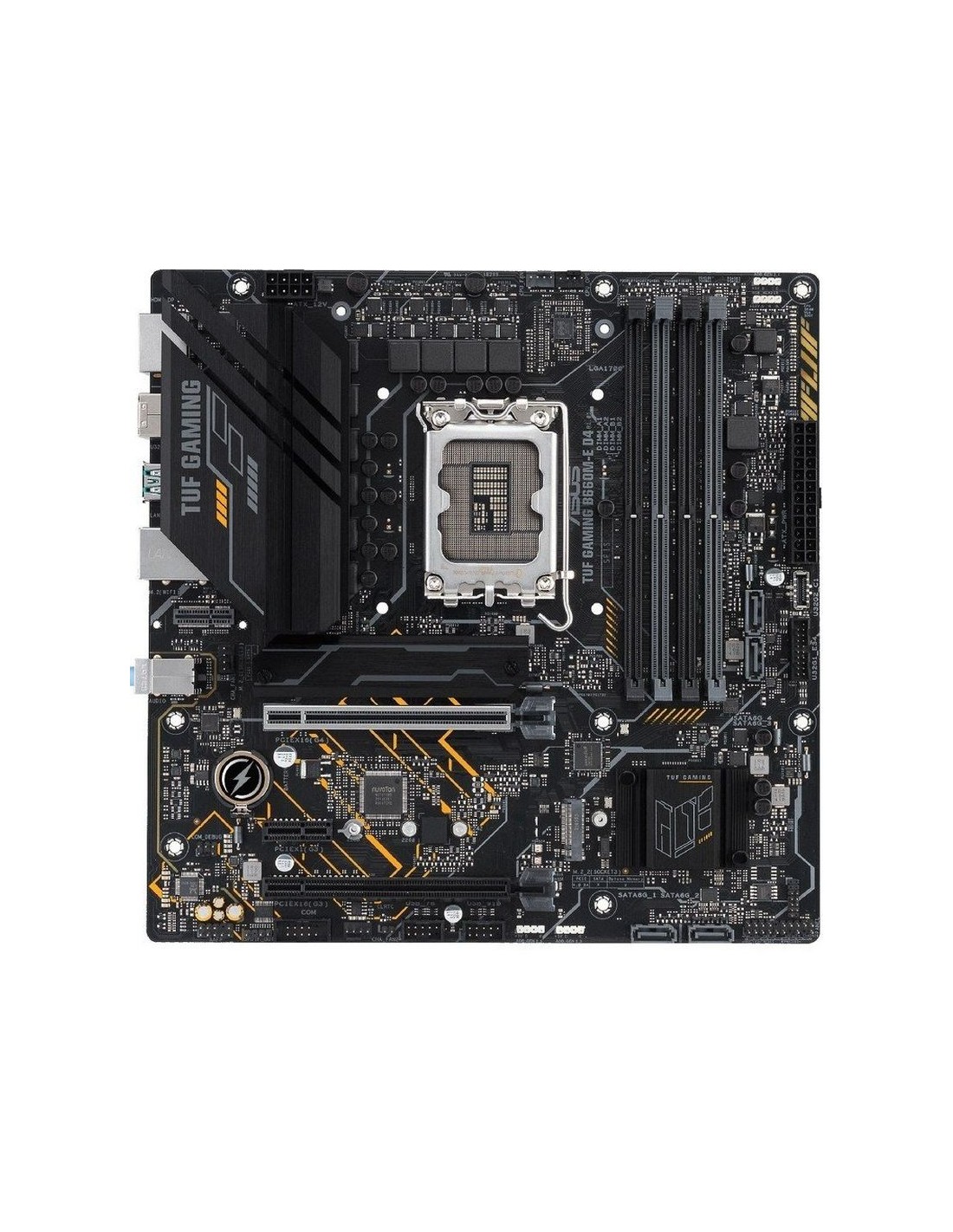 ASUS TUF GAMING B660M-E D4: Placa base Intel® B660 LGA 1700 mATX con ranura PCIe 4.0, dos ranuras M.2 PCIe 4.0, 10 etapas de alimentación, Realtek 2.5Gb Ethernet, DP, HDMI, USB 3.2 Gen. 2 de tipo C® frontal, Aura Sync Zócalo Intel® LGA 1700: Compatible con los procesadores Intel® de 12.ª Gen. Solución de alimentación mejorada: 10 etapas de alimentación, PCB de seis capas, zócalo ProCool, componentes TUF de grado militar y VRM Digi+ para ofrecer la máxima durabilidad. Refrigeración integral: Disipador VRM ampliado, disipador M.2 flexible, disipador PCH, conectores de ventilación híbridos y Fan Xpert 2+. Conectividad de última generación: Ranura PCIe 4.0, ranuras M.2 PCIe 4.0, USB 3.2 Gen. 2 de tipo C® frontal. Diseñada para gaming online: Realtek 2.5Gb Ethernet y TUF LANGuard. Cancelación de ruido bidireccional con IA: Reduce el ruido de fondo del micrófono y la salida de audio para que te comuniques con claridad mientras juegas y participas en videoconferencias. Model TUF GAMING B660M-E D4 CPU Intel® Socket LGA1700 for 13th Gen Intel® Core Processors & 12th Gen Intel® Core, Pentium® Gold and Celeron® Processors* Supports Intel® Turbo Boost Technology 2.0 and Intel® Turbo Boost Max Technology 3.0** * Refer to www.asus.com for CPU support list. ** Intel® Turbo Boost Max Technology 3.0 support depends on the CPU types. Chipset Intel® B660 Chipset Memoria 4 x DIMM, Max. 128GB, DDR4 5333(OC)/ 5066(OC)/5000(OC)/4800(OC)/4600(OC)/4400(OC)/4266(OC)/4000(OC)/3866(OC)/3733(OC)/3600(OC)/3466(OC)/3400(OC)/3333(OC)/3200/3000/2933/2800/2666/2400/2133 MHz Dual Channel Memory Architecture Supports Intel® Extreme Memory Profile (XMP) OptiMem II *Actual memory data rate depends on the CPU types and DRAM modules, for more information refer to www.asus.com for the Memory QVL (Qualified Vendors Lists). Gráficos 1 x DisplayPort** 1 x HDMI®port*** *Graphics specifications may vary between CPU types. Please refer to www.intel.com for any updates. **Support 4K@60Hz as specified in DisplayPort 1.4. ***Support 4K@60Hz as specified in HDMI 2.1. Ranuras de expansión Intel®13th & 12th Gen Processors* 1 x PCIe 4.0/3.0 x16 slot Intel® B660 Chipset* 1 x PCIe 3.0 x16 slot (supports x4 mode) 1 x PCIe 3.0 x1 slot * Supports Intel® Optane Memory H Series on PCH-attached PCIE slot Almacenamiento Total supports 2 x M.2 slots and 4 x SATA 6Gb/s ports* Intel®13th &12th Gen Processors M.2_1 slot (Key M), type 2242/2260/2280 Intel® B660 Chipset** M.2_2 slot (Key M), type 2242/2260/2280 (supports PCIe 4.0 x4 mode) 4 x SATA 6Gb/s ports * Intel® Rapid Storage Technology supports SATA RAID 0/1/5/10. ** Intel® Rapid Storage Technology supports Intel® Optane Memory H Series on PCH attached M.2 slots. Ethernet 1 x Realtek2.5Gb Ethernet TUF LANGuard Wireless & Bluetooth V-M.2 slot only (Key E, CNVi & PCIe)* * Wi-Fi module is sold separately. USB Rear USB (Total 6 ports) 2 x USB 3.2 Gen 2 ports (Type-A) 2 x USB 3.2 Gen1 ports (Type-A) 2 x USB 2.0 ports (2 x Type-A) Front USB (Total 7 ports) 1 x USB 3.2 Gen 2 connector (supports USB Type-C®) 1 x USB 3.2 Gen 1 header supports additional 2 USB 3.2 Gen 1 ports 2 x USB 2.0 headers support additional 4 USB 2.0 ports Audio Realtek 7.1 Surround Sound High Definition Audio CODEC - Supports: Jack-detection, Multi-streaming, Front Panel Jack-retasking - Supports up to 24-Bit/192 kHz playback Audio Features - Audio Shielding - Power pre-regulator reduces power input noise to ensure consistent performance - Premium audio capacitors - Dedicated audio PCB layers * A chassis with an HD audio module in the front panel is required to support 7.1 Surround Sound audio output. Puertos de E/S del panel posterior 2 x USB 3.2 Gen 2 ports 2 x USB 3.2 Gen 1 ports (2 x Type-A) 2 x USB 2.0 ports (2 x Type-A) 1 x DisplayPort 1 x HDMI® port 1 x Realtek2.5Gb Ethernet port 3 x Audio jacks 1 x V-M.2 slot (Key E) 1 x PS/2 Keyboard/Mouse combo port Conectores de E/S internos Fan and Cooling related 1 x 4-pin CPU Fan header 1 x 4-pin CPU OPT Fan header 2 x 4-pin Chassis Fan headers Power related 1 x 24-pin Main Power connector 1 x 8-pin +12V Power connector Storage related 2 x M.2 slots (Key M) 4 x SATA 6Gb/s ports USB 1 x USB 3.2 Gen 2 connector (supports USB Type-C®) 1 x USB 3.2 Gen 1 header supports additional 2 USB 3.2 Gen 1 ports 2 x USB 2.0 headers support additional 4 USB 2.0 ports Miscellaneous 3 x Addressable Gen 2 headers 1 x AURA RGB header 1 x Clear CMOS header 1 x COM Port header 1 x Front Panel Audio header (AAFP) 1 x 20-3 pin System Panel header with Chassis intrude function 1 x S/PDIF Out header Características especiales ASUS TUF PROTECTION - DIGI+ VRM - Enhanced DRAM Overcurrent Protection - ESD Guards - TUF LANGuard - Overvoltage Protection - SafeSlot Core+ - Stainless-Steel Back I/O ASUS Q-Design - M.2 Q-Latch - Q-DIMM - Q-LED (CPU [red], DRAM [yellow], VGA [white], Boot Device [yellow green]) - Q-Slot ASUS Thermal Solution - Flexible M.2 heatsink - VRM heatsink design ASUS EZ DIY - Box Headers - ProCool - SafeDIMM AURA Sync - AURA RGB header - Addressable Gen 2 headers Funciones de software ASUS Exclusive Software Armoury Crate - AURA Creator - AURA Sync - Fan Xpert 2+ - Two-Way AI Noise Cancelation AI Suite 3 - Performance And Power Saving Utility TurboV EVO EPU DIGI+ VRM TUF GAMING CPU-Z DTS Audio Processing Norton Anti-virus software (Free Trial version) WinRAR UEFI BIOS ASUS EZ DIY - ASUS CrashFree BIOS 3 - ASUS EZ Flash 3 - ASUS UEFI BIOS EZ Mode BIOS 128 Mb Flash ROM, UEFI AMI BIOS Manejabilidad WOL by PME, PXE Accesorios Cables 2 x SATA 6Gb/s cables Miscellaneous 1 x I/O Shield 1 x M.2 Rubber Package 1 x M.2 SSD screw package 1 x TUF Gaming sticker Installation Media 1 x Support DVD Documentation 1 x TUF Certification card 1 x User manual Sistema operativo Windows® 11 64-bit, Windows® 10 64-bit, Factor de forma mATX Form Factor 9.6 inch x 9.6 inch ( 24.4 cm x 24.4 cm ) https://www.asus.com/es/motherboards-components/motherboards/tuf-gaming/tuf-gamin