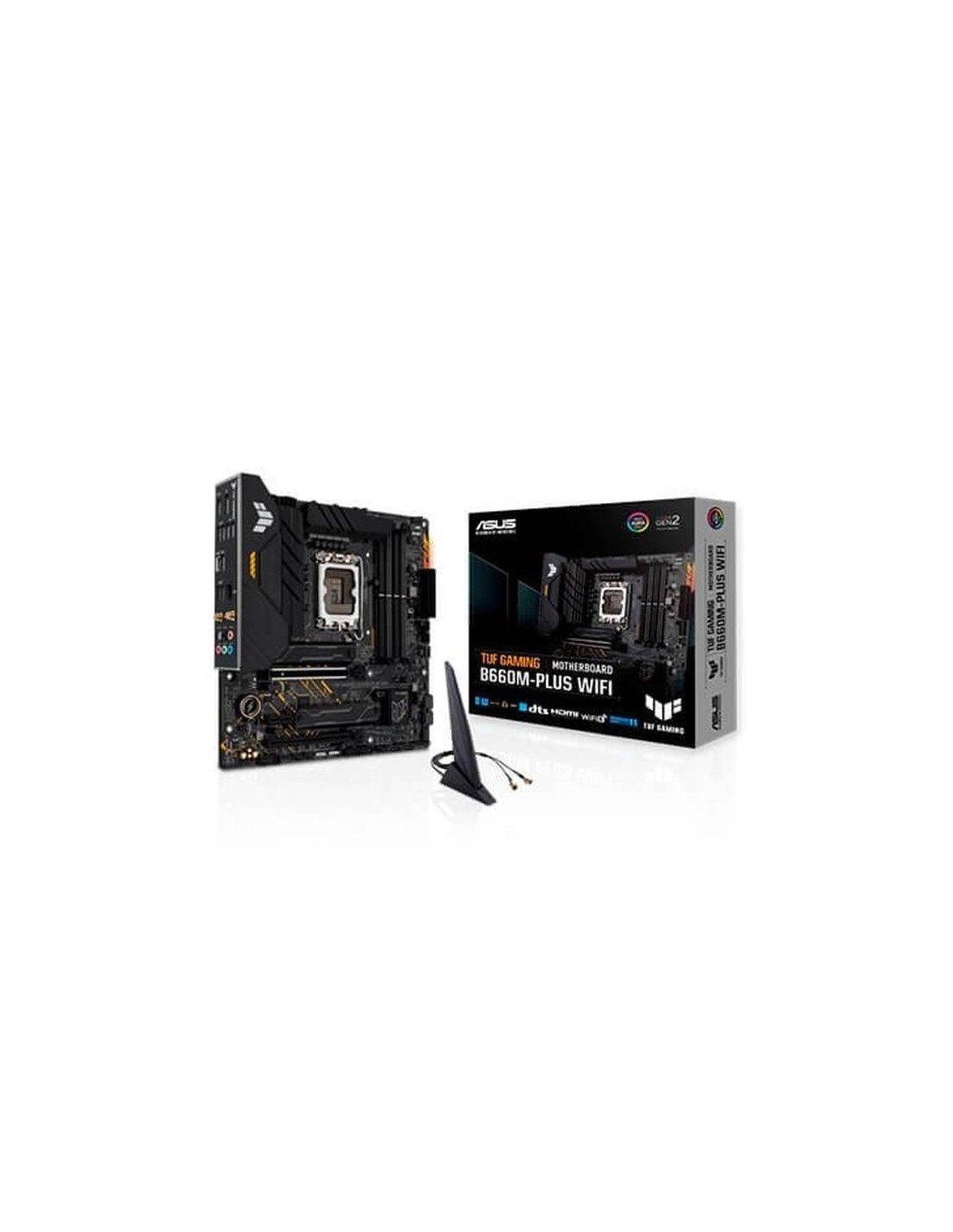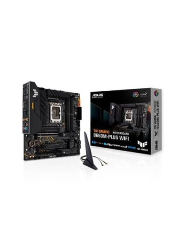 ASUS TUF GAMING B660M-PLUS WIFI. Fabricante de procesador: Intel, Socket de procesador: LGA 1700, Procesador compatible: Intel® Celeron®, Intel® Core i3, Intel® Core i5, Intel® Core i7, Intel® Core i9,.... tipos de memoria compatibles: DDR5-SDRAM, Memoria interna máxima: 128 GB, Tipo de ranuras de memoria: DIMM. Interfaces de disco de almacenamiento soportados: M.2, PCI Express 4.0, SATA III, Tipos de unidades de almacenamiento admitidas: HDD & SSD, Niveles RAID: 0, 1, 5, 10. Tipo de interfaz ethernet: 2.5 Gigabit Ethernet, Estándar Wi-Fi: Wi-Fi 6 (802.11ax), Wi-Fi estándares: 802.11a, 802.11b, 802.11g, Wi-Fi 4 (802.11n), Wi-Fi 5 (802.11ac), Wi-Fi 6 (802.11ax). Componente para: PC, Factor de forma: micro ATX, Familia del chipset: Intel Procesador Fabricante de procesador Intel Socket de procesador LGA 1700 Procesador compatible Intel® Celeron®, Intel® Core i3, Intel® Core i5, Intel® Core i7, Intel® Core i9, Intel® Pentium® Gold Sockets de procesador soportados LGA 1700 Memoria tipos de memoria compatibles DDR5-SDRAM Número de ranuras de memoria 4 Tipo de ranuras de memoria DIMM Memoria interna máxima 128 GB Canales de memoria Dual-channel Velocidades de reloj de memoria soportadas 4800,5000,5200,5400,5600,5800,6000 MHz No ECC Si Memoria sin buffer Si Conexión Estándar Wi-Fi Wi-Fi 6 (802.11ax) Ethernet Si Tipo de interfaz ethernet 2.5 Gigabit Ethernet Wifi Si Wi-Fi estándares 802.11a, 802.11b, 802.11g, Wi-Fi 4 (802.11n), Wi-Fi 5 (802.11ac), Wi-Fi 6 (802.11ax) Bluetooth Si Versión de Bluetooth 5.2 Interno I/O USB 2.0, conectores 2 Conectores USB 3.2 Gen 1 (3.1 Gen 1) 2 Número de conectores SATA III 4 Conector de audio en panel frontal Si Conector de potencia ATX (24 pines) Si Conector de ventilador CPU Si Número de conectores a ventilador de chasis 3 Conector de panel delantero Si Conector de energía EPS (8-pin) Si Conector eléctrico de 12 V Si Conector para tiras LED RGB Si Encabezados Thunderbolt 1 Número de conectores COM 1 Conector de instrusión a chasis Si Panel trasero Puertos de I/O (entrada/salida) Número de puertos USB 3.2 Gen 2x2 Tipo C 1 USB 2.0 2 USB 3.2 Gen 1 (3.1 Gen 1) 1 Cantidad de puertos tipo A USB 3.2 Gen 2 (3.1 Gen 2) 4 Pertos Ethernet LAN (RJ-45) 1 Salida Óptica de Audio 1 Conector para antena WiFi-AP 2 Puertos HDMI 1 Versión HDMI 2.1 DisplayPort 1 Versión de DisplayPort 1.4 Conector de auriculares 5 Reguladores del almacenaje Compatibilidad con RAID Si Número de unidades de almacenamiento compatibles 6 Interfaces de disco de almacenamiento soportados M.2, PCI Express 4.0, SATA III Tipos de unidades de almacenamiento admitidas HDD & SSD Niveles RAID 0, 1, 5, 10 Número de HDDs soportados 4 Ranuras de expansión PCI Express x16 (Gen 5.x) slots 1 Ranuras x1 PCI Express 1 Número de ranuras M.2 (M) 2 PCI Express x16 Gen (3.x) ranuras 1 BIOS Tipos de BIOS UEFI AMI BIOS, tamaño de memoria 128 MB/s Jumper Clear CMOS Si Gráficos Soporte para proceso paralelo No compatible Características Familia del chipset Intel Chipset Intel B660 Factor de forma Micro ATX Canales de salida de audio 7.1 canales Alimentación ATX Código de Sistema de Armomización (SA) 84733020 Componente para PC Sistema operativo Windows soportado Windows 10 x64, Windows 11 x64 Peso y dimensiones Ancho 244 mm Profundidad 244 mm Otras características Peso 1,35 kg Altura 68 mm Contenido del embalaje Cables incluidos SATA
