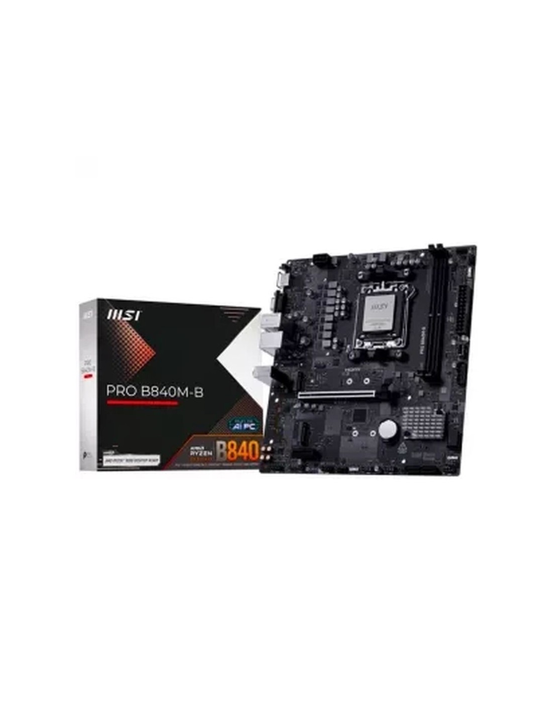 PLACA MSI PRO B840M-B,AMD,AM5,B840,4DDR5,256GB,1HDMI,4SATA3+2M.2,GBLAN,4USB3.2,MATX La MSI PRO B840M-B integra el chipset AMD B840 y socket AM5, compatible con procesadores Ryzen series 7000, 8000 y 9000. Ofrece soporte para DDR5 en doble canal con 2 DIMM hasta 8000+ MT/s (OC). Cuenta con 2 puertos M.2 PCIe Gen4 x4 y 4 SATA III. Dispone de una ranura PCIe 4.0 x16 y otra PCIe 3.0 x1. Integra LAN 2.5 GbE Realtek 8125 y audio 7.1 HD con Audio Boost. Salidas de vídeo HDMI 2.1 y VGA mediante APU. Ideal para entornos profesionales o de productividad. USB traseros: 7 (6x USB 5Gbps Type-A, 1x USB 5Gbps Type-C) USB frontales: 6x USB 2.0 Procesador Fabricante de procesador AMD Socket de procesador Socket AM5 Procesador compatible Ryzen series 7000, 8000 y 9000 Memoria tipos de memoria compatibles DDR5 Número de ranuras de memoria 1 Memoria interna máxima 256 GB Interno I/O USB 2.0, conectores 6 Panel trasero Puertos de I/O (entrada/salida) USB 2.0 6 USB 3.2 Gen 1 (3.1 Gen 1) Tipo C 1 Puertos HDMI SI Reguladores del almacenaje Interfaces de disco de almacenamiento soportados M.2 PCIe Gen4 x4 y 4 SATA III. Fabricante Representante legal MSI IBERIA, S.L. Contacto Representante legal spainsupport@msi.com Advertencias de Seguridad Garantía 2 Años