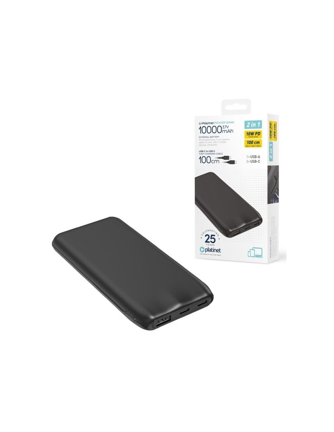 - Modelo: PMPB1010B - Marca: Platinet - Color: Negro - Capacidad: 10000mAh 3,7V - Entrada: 2xUSB-C - Salida USB: 1xUSB-A - Dimensiones/tamaño: 137,3 x 68,35 x 15,85mm