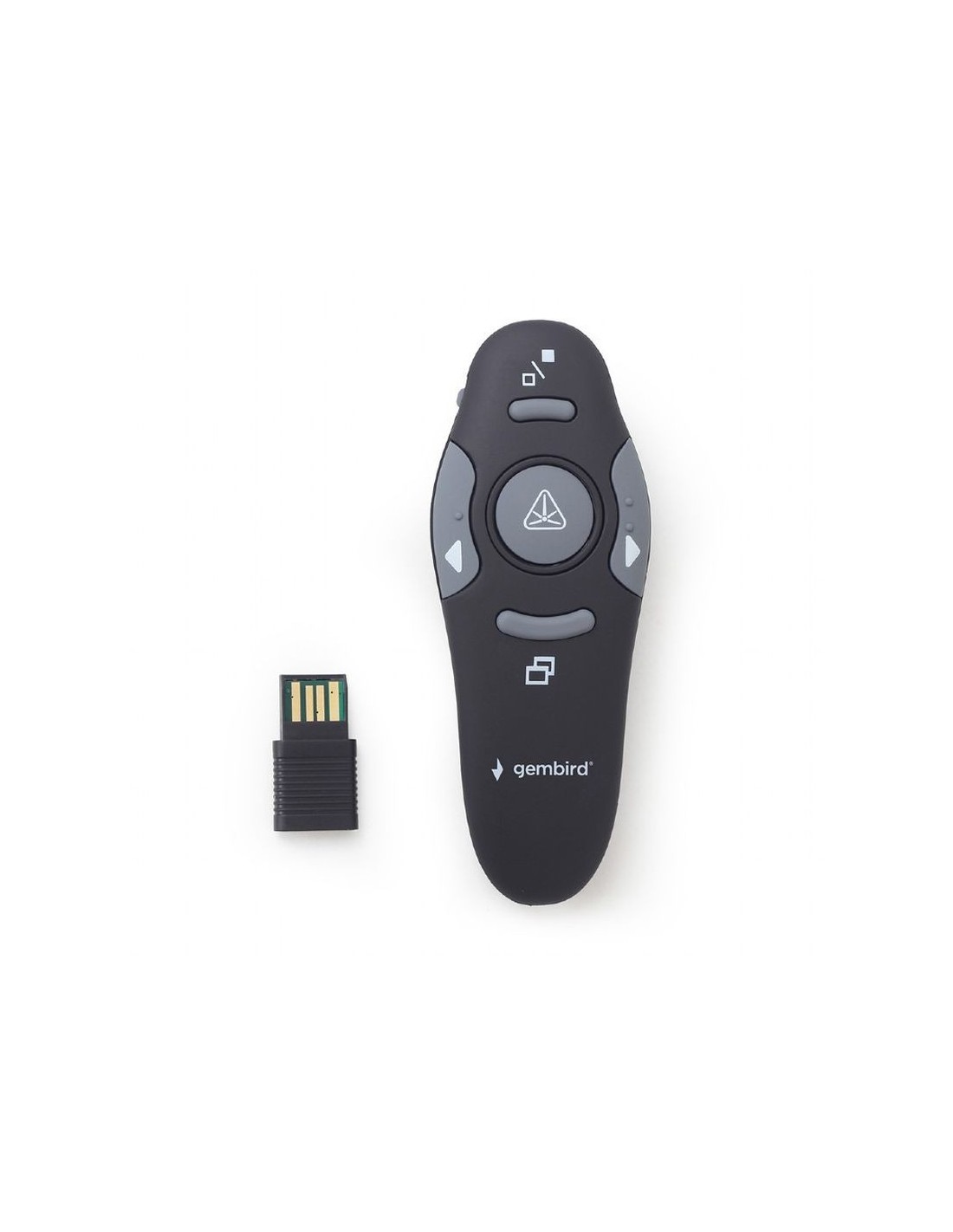 Inalmbrico, para que puedas moverte libremente durante tus presentaciones Los botones fciles de usar proporcionan un control perfecto de la presentacin en diapositivas. El prctico puntero lser le permite resaltar cualquier parte de su presentacin, incluso en las habitaciones ms oscuras. Plug & Play: simplemente conctelo y estar listo para usar Control remoto inalmbrico para presentaciones de PowerPoint Puntero lser rojo para resaltar fcilmente los detalles de la presentacin para su audiencia 4 botones para controlar las funciones de presentacin de PowerPoint ms utilizadas: diapositiva siguiente/anterior, encendido/apagado de pantalla, salir/reanudar presentacin, encendido/apagado del lser Interruptor de encendido prctico Plug & Play, no necesita software Clase de lser: Clase 2, EN 60825-1-2014 Salida mxima: Menos de 1 mW Longitud de onda: 640~660 nm (luz roja) Tecnologa inalmbrica: RF 2,4 GHz Distancia de control del presentador: hasta 10 m (segn el entorno) Fuente de alimentacin: 1 pila AAA (no incluida) Dimensiones: 105 x 38 x 25 mm Peso neto: 64 g