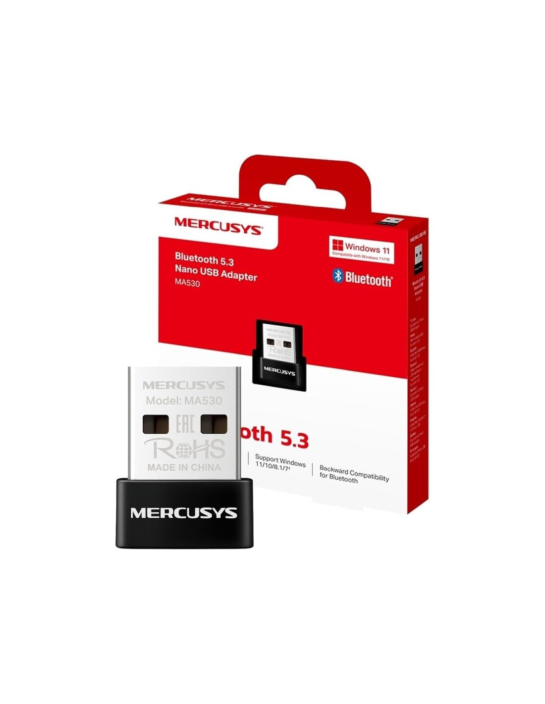 MA530 Nuevo Adaptador Nano USB Bluetooth 5.3 Bluetooth 5.3: mejora de la velocidad, la cobertura, la seguridad y la fiabilidad con respecto al Bluetooth de última generación Conectividad inalámbrica : proporciona una comunicación estable y conveniente entre los dispositivos Bluetooth y su PC o computadora portátil Tamaño nano: ultrapequeño para una portabilidad conveniente con un alto rendimiento confiable Compatibilidad con versiones anteriores: trabaje con dispositivos compatibles con la versión anterior de Bluetooth Sistema operativo compatible : Windows 11/10/8.1/7 HardwareDimensiones (An x Pr x Al) 19.15×14.94×7.19 mm Interfaces USB 2.0 Estándares y protocolos Bluetooth 5.3 OthersContenido de paquete Adaptador USB Nano Bluetooth 5.3 (MA530) Guía de instalación rápida Ambiente Temperatura de funcionamiento: 0?~40? (32? ~104?) Humedad de funcionamiento: 10%~90% sin condensación. Humedad de almacenamiento: 5%~90% sin condensación. Requerimientos de sistema Los sistemas operativos compatibles son Win 11/10/8.1/7 https://www.mercusys.com/es/product/details/ma530/#specifications