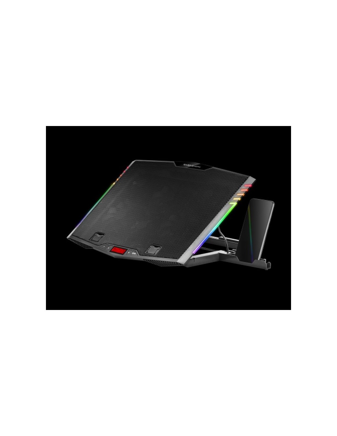CARACTERÍSTICAS TÉCNICAS- Dimensiones 433x350x37mm Peso 1218g Tamaño portátiles Hasta 17,3 Iluminación RGB Control Materiales Estructura Acero, ABS, Rejilla Aluminio Función stand Sí, altura regulable en 7 posiciones Extras Smartphone holder Puertos USB 2 Botón ON/OFF Sí Conexión USB 2.0 N de ventiladores 6 Voltaje DC 5V https://es.marsgaming.eu/es/refrigeracion/base-refrigeradora-y-stand-xl-mnbc5_mnbc5