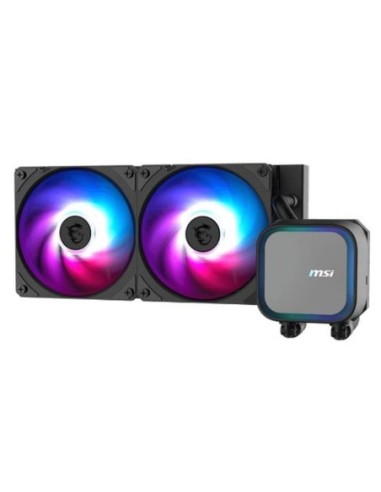 Placa base, Procesador Sistema de refrigeración líquida todo en uno 12 cm Sockets de procesador soportados: LGA 1700, LGA 1851, Zócalo AM4, Zócalo AM5 62,6 cfm Rodamiento tipo rifle Compatible con modulación por ancho de pulsos (PWM) 120 x 120 x 25 mm Negro 1 pieza(s) MSI MAG CORELIQUID A13 240. Tipo: Sistema de refrigeración líquida todo en uno, Diámetro de ventilador: 12 cm, Máximo flujo de aire: 62,6 cfm, Tipo de soporte: Rodamiento tipo rifle. Color del producto: Negro Peso y dimensiones Dimensiones del ventilador (A x A x P) 120 x 120 x 25 mm Altura de radiador 2,7 cm Altura del bloque de agua 5,7 cm Ancho de radiador 27,7 cm Ancho del bloque de agua 7,09 cm Longitud de cable 0,45 m Profundidad de radiador 12 cm Profundidad del bloque de agua 6,93 cm Control de energía Consumo energético del ventilador 1,8 W Consumo energético de la bomba 2,88 W Corriente de bomba 240 mA Corriente del ventilador 0,15 A Voltaje de bomba 5 V Voltaje del ventilador 5 V Otras características Material del tubo Ethylene-propylene diene monomer (EPDM) Contenido del embalaje Tornillos incluídos Si Diseño Base material de la placa Cobre Color del producto Negro Conector de ventilador 3 pines Iluminación LED Si Iluminación de color Multi Material de radiador Aluminio Número de ventiladores 2 Ventilador(es) Desempeño Cantidad por paquete 1 pieza(s) Compatible con modulación por ancho de pulsos (PWM) Si Conector de bomba 3 pines Diámetro de ventilador 12 cm Localización adecuada Placa base, Procesador Tiempo medio de fallo (MTTF) de la bomba 25000 h Tiempo medio de fallo (MTTF) del ventilador 40000 h Máximo flujo de aire 62,6 cfm Nivel de ruido de la bomba 20 dB Sockets de procesador soportados LGA 1700, LGA 1851, Zócalo AM4, Zócalo AM5 Tipo Sistema de refrigeración líquida todo en uno Tipo de soporte Rodamiento tipo rifle Velocidad de motor de bomba 3800 RPM
