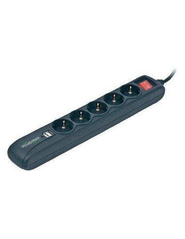 Diseñado para cargas eléctricas de hasta 16 A Estuche de plástico ignífugo de alta calidad Persianas de protección para niños en cada toma Dos puertos USB permiten cargar dos dispositivos simultáneos con un consumo total de energía de hasta 2A Supervisa que el circuito de carga USB funciona correctamente Especificaciones Carga máxima de potencia total: 250 V CA, hasta 16 A, 50 Hz - 60 Hz Zócalos: 5 X tipo alemán (Schuko) Enchufe alemán (Schuko) 16 A Cable de alimentación de 1,5 mm2, 1,5 m Puertos USB: 2 piezas, 5 V CC, corriente total hasta 2 A Dimensiones: 360 mm x 56 mm x 41 mm Rango de temperatura: -5...+ 40 °C Peso neto: 0,49 kg