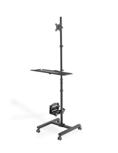 La estación de trabajo portátil Digitus DA-90374 ofrece espacio suficiente para el monitor, el teclado/ratón y el ordenador con ajuste flexible de la altura de trabajo. Con 4 ruedas maniobrables, puedes trasladar tu estación de trabajo donde sea necesario. Flexibilidad absoluta. El carro es ideal para trabajos en constante cambio, como talleres, consultorios médicos, almacenes, instalaciones de producción, etc. Crea un lugar de trabajo ajustable en altura para que varias personas lo puedan usar a pesar de tener alturas diferentes, y que se pueda mover libremente. El soporte para PC es variable en anchura y se puede adaptar a cualquier modelo. Características Tamaños de monitor compatibles: 17 - 32 Dimensiones de montaje VESA: 75 x 75, 100 x 100 Ángulo de inclinación: -15 hasta +15° Giratorio: 360° (firmemente ajustable) Rotación del monitor: 360 Capacidad de carga para el monitor: 8 kg máx. Capacidad de carga del soporte para teclado: 2 kg máx. Capacidad de carga para el ordenador: 10 kg máx. Se puede ajustar la altura de todos los estantes Soporte ancho para ordenador personalizable: 122 hasta 212 mm Guía para cables integrada Metal macizo con recubrimiento en polvo de alta calidad Dimensiones: 50 x 49,5 x 178 cm (la. x an. x pr.) Peso: 10,3 kg Gestor de cableado incluido Especificaciones Digitus DA-90374 Peso y dimensiones Peso: 10,3 kg Ancho: 500 mm Profundidad: 495 mm Altura: 1780 mm Ergonomía Ajustes de altura: Si Ángulo de giro: 360° Ángulo de rotación: 360 Estanterías ajustables: Si Estantes incluidos: 1 Ruedas: Si Número de ruedas: 4 rueda(s) Cable de gestión: Si Contenido del embalaje Manual de usuario: Si Diseño Tipo: Soporte de suelo con ruedas para pantalla plana Color del producto: Negro Material de la carcasa: Metal Montaje Capacidad máxima de peso: 8 kg Tamaño máximo de pantalla: 81,3 cm (32) Adecuado para: Monitor de ordenador Compatibilidad con interfaz de montaje (min): 75 x 75 mm Compatibilidad con interfaz de montaje (máx): 100 x 100 mm Tamaño mínimo de pantalla: 43,2 cm (17) Interfaz de panel de montaje: 75 x 75,100 x 100 mm Número de pantallas soportadas: 1