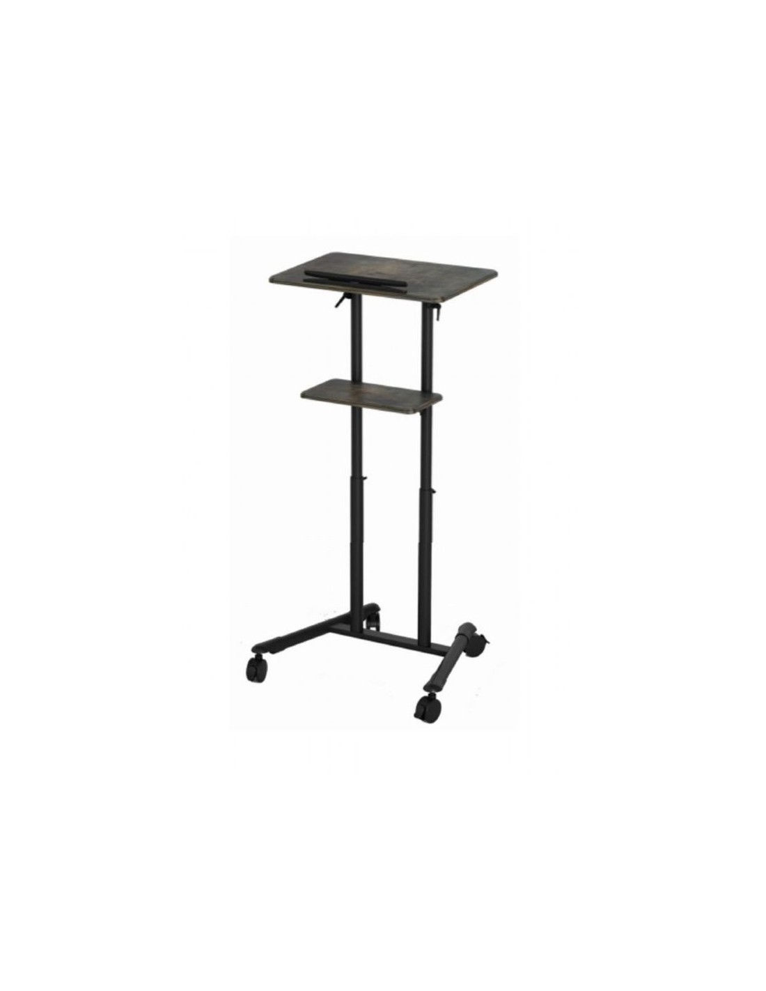 Pupitre de conferencia mvil con ruedas pivotantes, negro Atril mvil universal Ideal tambin para proyectores y proyectores de luz Prctico e imprescindible para oficinas y centros de enseanza Pupitre de conferencia mvil con ruedas Construccin de acero con ajuste de altura integrado Pupitre basculante y prctico estante para equipos o materiales Ruedas duraderas con mecanismo de bloqueo Especificaciones Material: steel, plastic, MDF Desk tilt angle: - 30 Desk weight capacity: 20 kg Shelf weight capacity: 10 kg Height adjustment: 1110 - 1345 mm Product dimensions: 690 x 530 x (1110-1345) mm Desk dimensions: 600 x 400 mm Shelf size: 400 x 215 mm Base dimensions: 690 x 530 mm