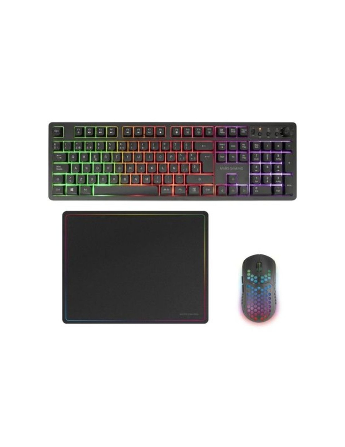 COMBO INALÁMBRICO GAMING 3EN1 MCPWX Descubre la libertad inalámbrica definitiva con el MCPWX, el combo gaming 3 en 1 que combina un teclado completo FRGB, un ratón ultraligero y una alfombrilla de alta precisión. Gracias a la tecnología DualPro Link 2.4GPRO, cada periférico funciona con su propio canal USB dedicado, asegurando una conexión inalámbrica estable, sin interferencias ni latencia. Libertad inalámbrica. Control sin interrupciones. Tecnología DualPro Link 2.4GPRO Teclado inalámbrico completo con control multimedia Ratón gaming ultraligero con 3200 DPI Alfombrilla gaming con base antideslizante TECNOLOGÍA DUALPRO LINK El MCPWX ofrece una experiencia inalámbrica fluida gracias a su sistema DualPro Link 2.4GPRO, que proporciona un canal USB dedicado tanto al teclado como al ratón. Esto asegura un rendimiento sin interferencias. Olvídate del lag y disfruta de un control total en cada movimiento. TECLADO INALÁMBRICO Disfruta de un teclado de tamaño completo con retroiluminación Rainbow breathing, diseñado para ofrecer comodidad, estabilidad y estilo. Su formato inalámbrico con receptor USB 2.4GPRO dedicado garantiza libertad total de movimiento y una experiencia de uso fluida para gaming o trabajo. RATÓN GAMING ULTRALIGERO Con solo 79 gramos, el ratón ultraligero con diseño HIVE, ilumianción RGB y sensor óptico profesional ajustable a 800/1600/3200 DPI ofrece una experiencia inalámbrica precisa e independiente gracias a su propio receptor USB 2.4GPRO. Su diseño recargable con modo de ahorro de energía garantiza sesiones prolongadas sin interrupciones. CONTROL MULTIMEDIA INTEGRADO Incluye un dial multimedia y tres botones dedicados para ajustar el volumen, pausar o cambiar de pista rápidamente. Accede a tus funciones multimedia sin interrupciones y con total comodidad. ALFOMBRILLA GAMING DE ALTO RENDIMIENTO La alfombrilla de 360x260?mm con diseño rainbow y superficie nanotextil suave permite un deslizamiento controlado y preciso del ratón. Su base de goma natural antideslizante garantiza una fijación firme sobre cualquier superficie. COMPATIBILIDAD MULTIPLATAFORMA El combo MCPWX es compatible con Windows, Linux, Mac, así como consolas PS4, PS5, Xbox One, Xbox Series X-S y Switch. Especificaciones TECLADO Peso 608g Dimensiones 445x140x35mm Diseño Completo Material teclado ABS Color Negro / Blanco Iluminación FRGB Rainbow Tecnología Membrana Tipo de switch H-Mech Duración 20 millones Longitud del cable 145cm Tipo de cable Recubrimiento de goma Conector USB 2.0 Inalámbrico Si, Receptor USB inalámbrico 2.4Ghz (Incluido) Frecuencia de refresco Ultra-rápida Anti-ghosting Sí Compatibilidad de S.O. Windows, *Linux, *Mac, PS4, PS5, XBOX ONE, XBOX SERIES X-S, Switch *(Algunas funciones pueden no funcionar debido a limitaciones del sistema operativo) Voltaje DC 5V Corriente 300mA RATÓN Peso 79±5g Dimensiones 125x64x42mm Ergonomía Diestro Botones 6 Iluminación RGB flow Materiales ABS Color ratón Negro / Blanco Sensor Óptico DPI 800/1600/3200 Frecuencia de refresco Ultrarápido Longitud del cable 50cm Conector USB-C Compatibilidad de S.O. Windows, *Linux, *Mac, PS4, PS5, XBOX ONE, XBOX SERIES X-S, Nintendo Switch *(Algunas funciones pueden no funcionar debido a limitaciones del sistema operativo) Inálambrico Si, Receptor USB inalámbrico 2.4Ghz (Incluido) Corriente 300mA Voltaje DC 5V ALFOMBRILLA Dimensiones 360x260mm Peso 180g Material superficie Nanotextil Material base Caucho natural Bordes 3mm Contenido de la caja Ratón, teclado, alfombrilla, 2 adaptadores USB inalámbricos, cable USB y manual de usuario