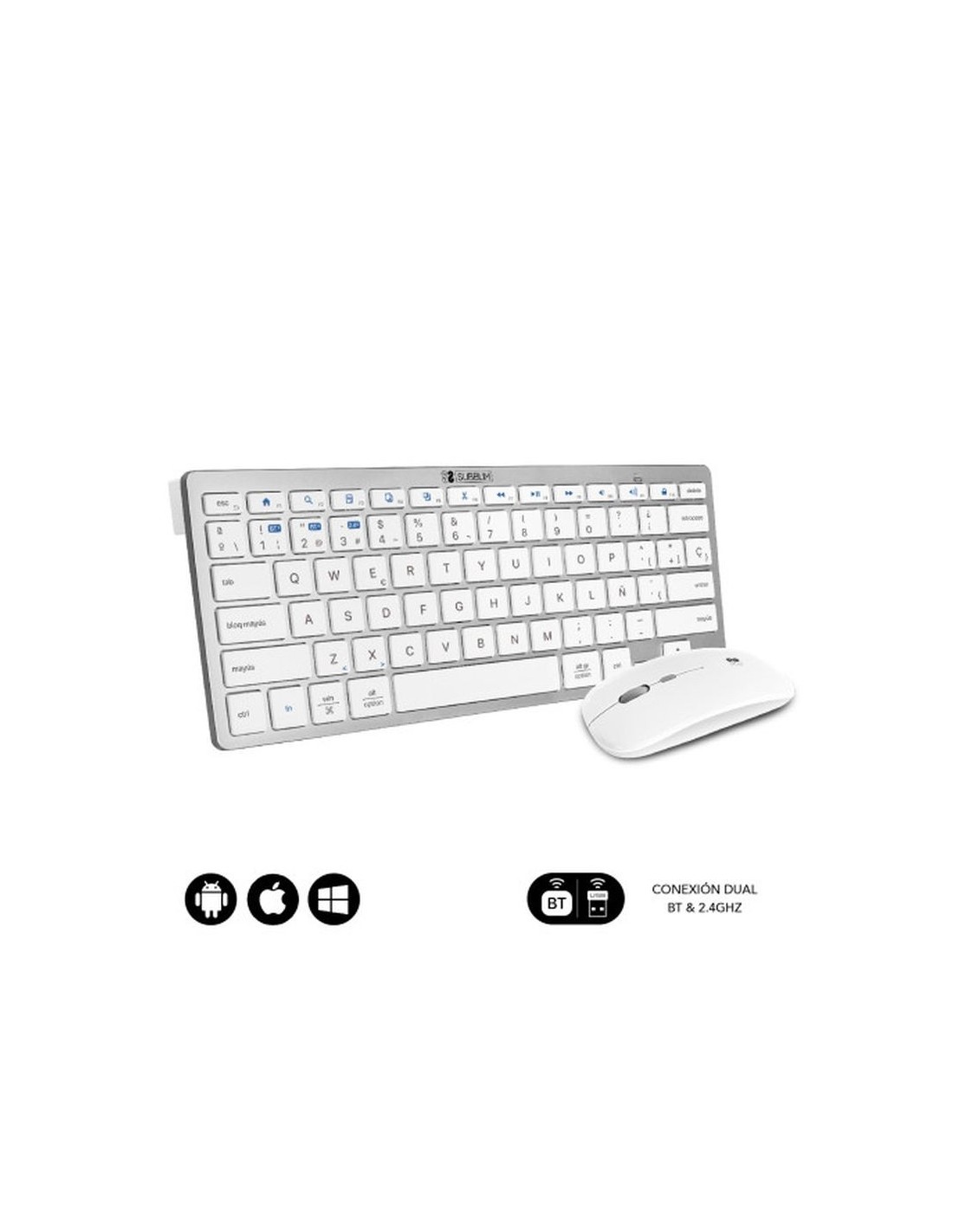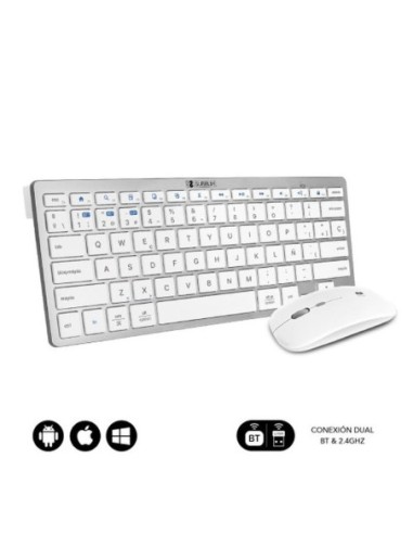 Crea un espacio minimalista, moderno y silencioso con la compacta combinación con tecnología inalámbrica Bluetooth y además por radio frecuencia 2.4G. El Combo Multidispositivo de Subblim, compuesto de un teclado y un ratón de diseño avanzado de alta precisión de hasta 1600DPI, son perfectos para hacer las tareas con eficacia y permite una productividad constante. El tamaño de la combinación facilita el trabajo en los espacios de escritorio más reducidos y resulta la pareja perfecta para usarlos cuando estás de viaje o en reuniones de trabajo. Triple conexión. El Combo de Subblim es ideal si deseas disfrutar de la libertad de trabajar con varios dispositivos a la vez. Su funcionalidad de emparejamiento triple le permite conectar hasta tres dispositivos al teclado, dos mediante tecnología inalámbrica Bluetooth y otro mediante radio frecuencia 2.4G. Podrás conectar de forma simultánea el Ordenador portátil, el teléfono móvil y la Tablet cambiando entre ellos de una forma muy sencilla. Práctico Control. Con doce teclas de funciones multimedia*, tendrás accesos directos a tus funciones favoritas al alcance de tu mano. Cambia fácilmente entre las funciones más utilizadas para cada sistema operativo, ya sea a tu PC con Windows, iPhone o dispositivo Android. Tendrás acceso rápido a los controles del dispositivo para iOS y Android, como el botón de inicio, activar la función de búsqueda, tomar instantáneas, controlar tus medios o bloquear tu dispositivo. *La compatibilidad de las teclas de función varía según el sistema operativo Diseño ergonómico y silencioso. El mecanismo de tijera de las teclas hace que escribir sea cómodo y muy receptivo. El ángulo del teclado proporciona soporte para la muñeca para un trabajo sin dolor durante largos períodos de tiempo. El mouse silencioso y su clic muy suave garantizan un ambiente tranquilo y sereno. Estilo elegante y compacto. Las teclas son planas y elegantes, estilo Mac. Este diseño ahorra espacio en su escritorio. El mouse, con su línea elegante y acabado plano, agrega un toque de elegancia a su escritorio. Ratón . El elegante ratón inalámbrico con batería de litio recargable de alta duración, tiene 3 niveles de DPI ajustables (800/1200/1600), para que pueda elegir la velocidad correcta del puntero en función de sus actividades como por ejemplo trabajo, juegos o uso en una pantalla de TV.