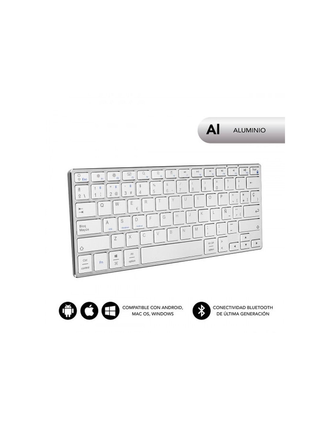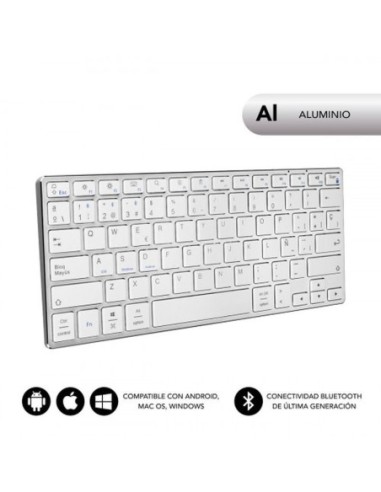 Características: Diseño Aluminio: Disfruta de sensaciones Premium con un excelente acabado en Aluminio, máxima precisión en tus movimientos y una cuidada estética vanguardista con los bordes biselados. Máxima elegancia y resistencia. Conecta 3 dispositivos BT: Para escribir en la Tablet, Smartphone u Ordenador, presiona el botón Bluetooth asignado al dispositivo específico , en segundos el teclado está conectado y listo para usar de forma sencilla. Batería Li-ion Recargable: Cuando el indicador LED te indique que el nivel de batería es bajo, conecta tu dispositivo por USB a una fuente de corriente y sigue usando tu teclado mientras se recarga gracias a su Batería de Li-ion. Compatibilidad: Se adaptan automáticamente tanto a los dispositivos Apple, Windows o Android. Ahorro de Energía: Después de 10 min de inactividad, el teclado pasará automáticamente al modo suspensión para conservar las baterías. Simplemente presione cualquier tecla y espere 2-3 segundos para volver a activarlo. Especificaciones Subblim Advance Compact Silver: Tipo de teclado: membrana Diseño: slim Superficie: Soft touch Batería Li-Ion 350 mAh Número de teclas: 78 Vida útil de las teclas: 5 millones de presiones Tiempo de trabajo: 90 horas Tiempo en espera: 120 días Bluetooth: 3.0 Batería LI-ION 350 mAh Voltaje de funcionamiento: 3.0v-5.0v Corriente de trabajo: < 5.0mA Corriente en espera: 200uA Compatible con dispositivos Apple, Android y Windows Incluye batería de litio y carga por USB