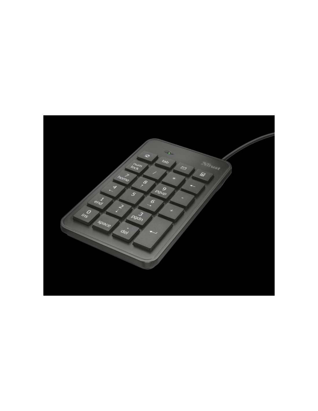 Teclado numérico USB Elegante teclado numérico ultradelgado para facilitar la entrada de datos numéricos en cualquier portátil con Windows Características Añada un práctico teclado numérico a su portátil o a su teclado de tamaño pequeño5 teclas adicionales (Explorador/Inicio, Tabulador, Correo, Espacio y Calculadora)Diseño en ángulo con 23 teclas de tamaño normal y perfil bajoPara escribir de forma cómoda, precisa y rápidaFácil de usar: solo hay que conectarlo y listoPara usuarios diestros y zurdosCable de 1,5 m Imágen del producto Especificaciones General Height of main product (in mm) 148 mm Width of main product (in mm) 90 mm Depth of main product (in mm) 21 mm Total weight 127 g Connectivity Connection type wired Cable length main cable 145 cm Features Special features Browser - Home key Tab - key Mail app - key Calculator app - key Backspace - key Spacebar - key Input Power source USB Compatibility Compatible Device Types pc, laptop Compatible Software Platforms Windows Control Indicators Num-lock información extra GeneralNúmero de referencia: 22221Código EAN: 8713439222210Garantía : 2 añosPeso del producto (neto): 127 g Contenido del paqueteTeclado con cable conectado Requisitos del sistemaWindows 10, 8 o 7Puerto USB https://www.trust.com/es/product/22221-xalas-usb-numeric-keypad