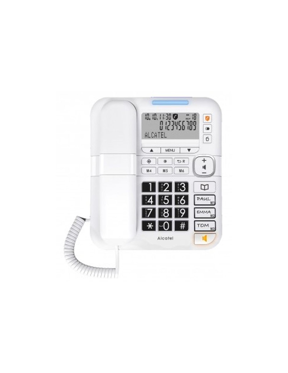 ALCATEL TELEFONO FIJO COMPACTO TMAX70 BLANCO Funciones: Manos libres 6 teclas de memorias directas (números) con imagen integrable Teclado con grandes teclas LED luminoso de llamada entrante Función despertador Rellamada a los 16 últimos números marcados (Bis) Son Tecla R, #, * Tecla « secreto » Características técnicas Posibilidad de posición mural Tipo de numeración FV/DC Tiempo de flashing (en ms) 100, 300, 600 Cables de líneas RJ11/RJ11 desconectable + adaptador francés Peso 620g Dimensiones de la base en mm (largo x profundidad x altura): 200 x 195 x 90 Volumen sonoro del auricular ajustable (4 niveles) 1 melodía Volumen de melodías ajustable (3 niveles)