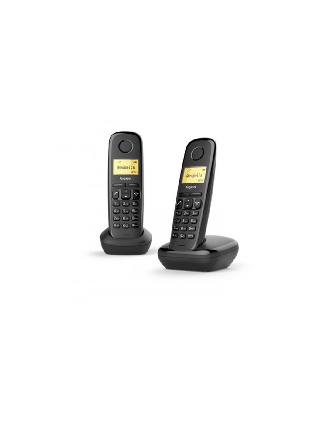 Descubra el Gigaset A170. Es un teléfono inalámbrico sencillo y fiable con calidad Made in Germany. Presenta teclás fáciles de usar con puntos sensibles a la presión para marcar sin esfuerzo. Su gran pantalla gráfica de matriz de puntos iluminada facilita la lectura. Y gracias al registro preconfigurado en la estación base, la instalación no requiere más que un rápido plug & play. Y hay algo más de lo que no tendrá que preocuparse: el Modo Eco Plus sin radiaciónlo convierte en la opción ecológica de la telefonía. Características: Lista de llamadas de hasta 25 entradas Remarcación de los últimos 10 números Indica la fecha y hora además de la función de alarma Teclas fáciles de usar con puntos sensibles a la presión Visualización de llamada con número o nombre ECO DECT Especificaciones: Características generales Conexión Analógico Número de teléfono (analógica) 1 Número de conversaciones simultáneas (analógica) 1 Estándares DECT ECO DECT Reducción automática de transmisión de energía, Libre de radiación en modo standby, Bajo consumo de energía Características adicionales Tiempo en modo en espera hasta (h) 200 Tiempo de conversación hasta (h) 18 Número de registros en agenda telefónica (nombre/número) 50 Función de alarma Si Señalización óptica de llamada (pantalla iluminada) Pantalla iluminada Llamadas internas gratuitas Si Transferencia de teléfonos/libreta de direcciones interna a través de DECT (de terminal a terminal) Si Transferencia interna de llamadas externas, llamada de conferencia, devolución de llamada Si Características de sonido Volumen ajustable Mediante el Menú Número de tonos 10 Características de la pantalla Tipo de pantalla Alfanúmerica blanco y negro Dimensiones (alt. x anch. mm) 22 x 34 Diagonal (pulg.) 1,5 Resolución (px) 70 x 8 Visualización del llamante en pantalla Indicación del número de teléfono llamante (CLIP) Lista de las últimas llamadas perdidas (número) con hora y fecha 25 Menú en varios idiomas (varios idiomas de pantalla) Si Tiempo / Fecha mostrada Si Número de idiomas 24 Características del teclado Manejo sencillo con teclas de navegación Si Tamaño/especificaciones técnicas Terminal, alt x anch x prof en mm 159 x 48 x 30 Terminal, peso incl. batería en g 108 Estación base, alt x anch x prof en mm 89 x 89 x 43 Estación base, peso en g 63 Cargador, alt x anch x prof en mm 38 x 69 x 75 Cargador, peso en g 34 Batería 2 x NiMH AAA - Llamada colectiva entre terminales internos. http://www.gigaset.com/hq_en/gigaset-a170/