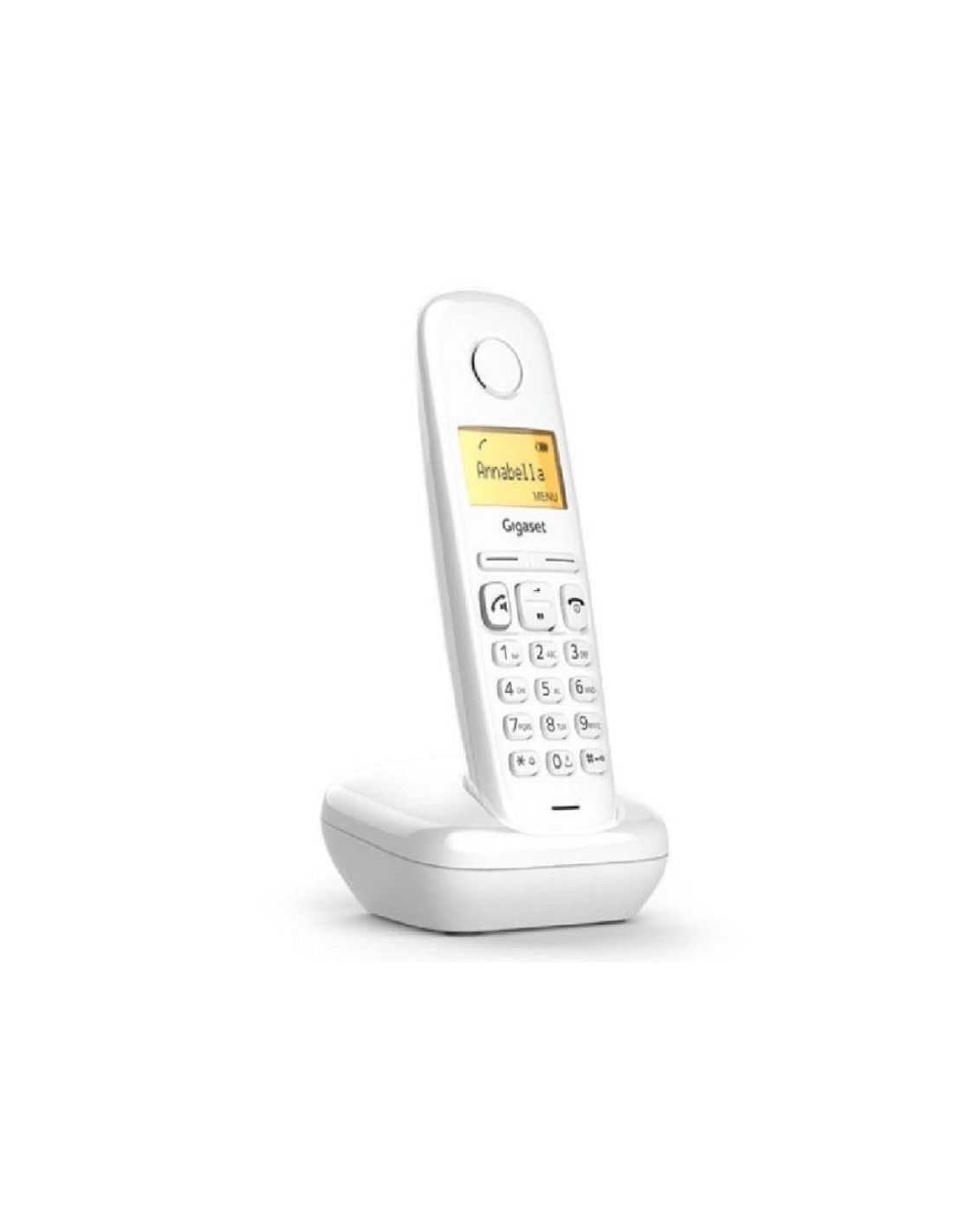 Una buena inversión: Gigaset A270 tiene todo lo que un teléfono inalámbrico necesita. ¿Está buscando un teléfono fijo fácil de usar que no cueste mucho dinero? En tal caso el Gigaset A270 con función de conversación en manos libres y calidad Made in Germany se ajusta perfectamente a su necesidad. Gracias a sus teclas con puntos sensibles a la presión, utilizarlo es fácil y cómodo. Pulsando la tecla iluminada de conversación en manos libres, podrá cocinar, limpiar o realizar cualquier otra tarera mientras habla por teléfono. Útil, ¿verdad? Al igual que la sencilla instalación plug&play. El teléfono está preregistrado a la estación base asi que puede comenzar a utilizar el Gigaset A270 según lo saque de su caja. Y esto no es todo. Puede estar seguro de que el Gigaset A270 es respetuoso con el medioambiente ya que incopora el modo Eco Plus. ¿Qué más necesita de un teléfono inalámbrico? Plug & play instalación muy fácil: desembalar, conectar y llamar (terminal registrado de fábrica) Re-marcación de los últimos 10 números Muestra la fecha y hora, además de la función de alarma Teclás fáciles de usar con puntos sensibles a la presión Visualización de la llamada con número o nombre ECO DECT Dejándolo claro: la gran pantalla gráfica iluminada. El nuevo A270 tiene una gran pantalla iluminada en color ámbar que ofrece toda la información en un vistazo. La pantalla gráfica ofrece una máxima legibilidad y además está iluminada. Puede tener toda la información en un vistazo - en cualquier momento. Acceder a la agenda de contactos o a la lista de llamadas nunca ha sido tan fácil. Todos se simplifica: fácil uso y libertad para llamar. Bueno para sus nervios. Para asegurar que no está perdiendo su tiempo, el Gigaset A270 se ha diseñado para que el proceso de realizar una llamada sea lo más rápido posible. Puede utilizarlo tan pronto como lo lleve a casa plug & play. Con los puntos sensibles a la presión de sus teclas la marcación también es muy cómoda. Resulta más fácil leer y navegar. E incluso si se está ocupado y se necesita atender una llamada basta con presionar la tecla de manos libres para disfrutar de la flexibilidad que ofrece la conversación en manos libres. Se puede disfrutar de esta opción durante horas, debido al largo tiempo en conversación de hasta 18 horas que permite el teléfono. No hay por qué preocuparse por la duración de la batería del Gigaset A270 ofrece un tiempo en espera de hasta 200 horas. Gran almacenamiento de información: contacte con amigos y familia en segundos. Tenga todos sus números de teléfono en un solo lugar: basta con utlizar la agenda del teléfono inalámbrico Gigaset A270 con capacidad para 80 contactos y asi estar en contacto con los seres más queridos. Y para hacer las cosas aún más fáciles, la lista de llamadas registra los números de teléfono de las 25 llamadas entrantes o perdidas más recientes y las 10 llamadas salientes más recientes. Eso es perfecto para volver a llamar o recuperar una llamada interrumpida. Diseñado para ser útil : toda la información que se necesita durante el día. El teléfono analógico Gigaset A270 es un equipo muy fiable para tener toda la información. Su función de identificación del llamante le facilita inmediatamente quién está llamando cuando suena el teléfono. El Gigaset A270 indica también la fecha y duración de la llamada y cuenta con una función de alarma. Características generales Conexión: Analógico Número de teléfono (analógica): 1 Número de conversaciones simultáneas (analógica): 1 Standares DECT: DECT ECO DECT: Reducción automática de transmisión de enrgía, Libre de radiación en modo standby, Bajo consumo de energía Características adicionales Tiempo en modo en espera hasta (h): 200 Tiempo de conversación hasta (h): 18 Número de registros en agenda telefónica (nombre/número): 80 Función de alarma: Si Señalización óptica de llamada (pantalla iluminada): Pantalla iluminada Llamadas internas gratuitas: Si Transferencia de teléfonos/libreta de direcciones interna a través de DECT (de terminal a terminal): Si Transferencia interna de llamadas externas, llamada de conferencia, devolución de llamada: Si Características de sonido Conversación manos libres: Sí Conversación manos libres terminal / baset: Terminal Volumen ajustable: Mediante el Menú Número de tonos: 10 Características de la pantalla Tipo de pantalla: Alfanúmerica blanco y negro Dimensiones (alt. x anch. mm): 22 x 34 Diagonal (pulg.): 1,5 Resolución (px): 70 x 8 Visualización del llamante en pantalla: Indicación del número de teléfono llamante (CLIP) Lista de las últimas llamadas perdidas (número) con hora y fecha: 25 Menú en varios idiomas (varios idiomas de pantalla): Si Tiempo / Fecha mostrada: Si Número de idiomas: 24 Características del teclado Manejo sencillo con teclas de navegación: Si Tamaño/especificaciones técnicas Terminal, alt x anch x prof en mm: 159 x 48 x 30 Terminal, peso incl. batería en g: 114 Estación base, alt x anch x prof en mm: 89 x 89 x 43 Estación base, peso en g: 63 Cargador, alt x anch x prof en mm: 38 x 69 x 75 Cargador, peso en g: 34 Batería: 2 x NiMH AAA
