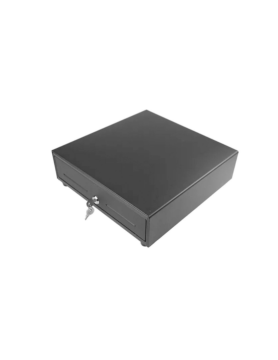 Cajón portamonedas RJ12 Compartimentos de monedas y billetes ajustables (8 de monedas y 4 de billetes). Carcasa metálica de alta resistencia. Ranura frontal para las transacciones sin efectivo o de grandes billetes. Cerradura de dos posiciones. Color negro. Dimensiones: 410 x 415 x 110 mm. General Anchura (mm): 410 Fondo (mm): 410 Interface: RJ12 Impresora + Microswitch Separadores billetes: 4 Separadores monedas: 8 Tipo de apertura: Frontal