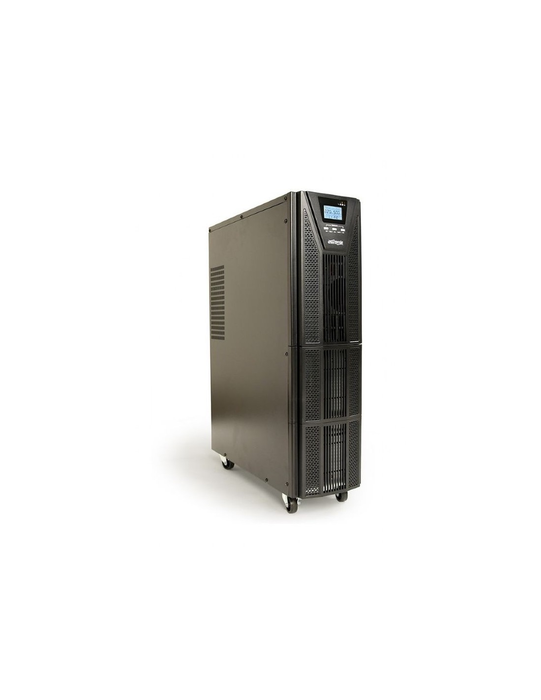 DEFENSA MÁXIMA Salida de onda sinusoidal pura Proporciona energía de respaldo: evita la pérdida de datos Protege su equipo sensible y valioso Soporte perfecto para instalaciones de paneles solares y otros equipos sensibles que requieren entrada de onda sinusoidal pura Compacto y confiable: ideal para uso doméstico y en oficinas pequeñas UPS tipo online: conversión de doble voltaje con salida de onda sinusoidal pura sin cambiar la alimentación interfaz USB Regulación automática de voltaje CA (AVR) Protección inteligente contra sobrecargas y cortocircuitos Alarmas sonoras y visuales. Pantalla LCD e indicación de estado LED Batería interna con protección contra sobrecarga y sobredescarga. Tipo: en línea Forma de onda: sinusoidal, <2 % de distorsión con carga lineal (<5 % no lineal), PF > 0,99 Entrada: CA 176 ~ 288 V, 40 - 70 Hz con detección automática Salida: CA 208 V / 220 V / 230 V / 240 V (configurable) ±1%, detección automática de 45 Hz/65 Hz Tiempo de conmutación: cerca de 0 ms Tiempo de respaldo: 30 minutos (depende de la carga) Batería: UPS con plomo-ácido sellado 12V/9Ah 16 piezas; 192 VCC Tiempo de carga: 90% de capacidad restaurada en 8 horas Tomas de entrada: Entrada de bloque de terminales - Monofásico de tres hilos (1F + N + PE); Zócalos de salida: Entrada de bloque de terminales; 6x salidas de enchufe C13 Comunicación de interfaz: USB; ranuras opcionales: RS485 / contactos secos / SNMP / compensación de temperatura de la batería Condiciones de funcionamiento: 0°C~40°C, con humedad 20~90%RH sin condensación Potencia: 10000 VA (~10000 W) Ruido: < 55 dB a 1 m de distancia Dimensiones: 310 x 685 x 941 mm Peso del producto: 62 kg Función arranque en frío